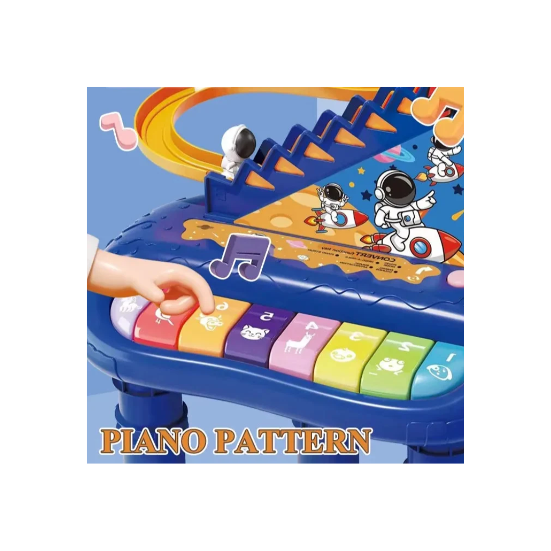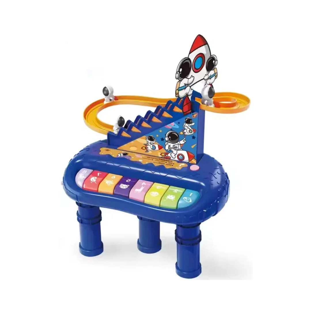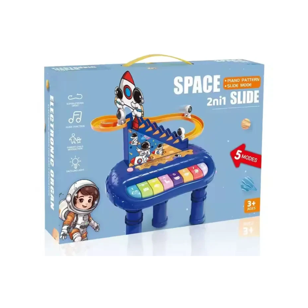 Fun 2-in-1 space-themed toy with piano keys and rolling slide track. Features light, music, and interactive play.