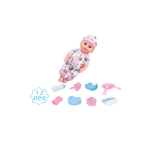 • Comes with 12 care accessories: bottle, pacifier, soap, bath sponge, potty, and cloth diapers.