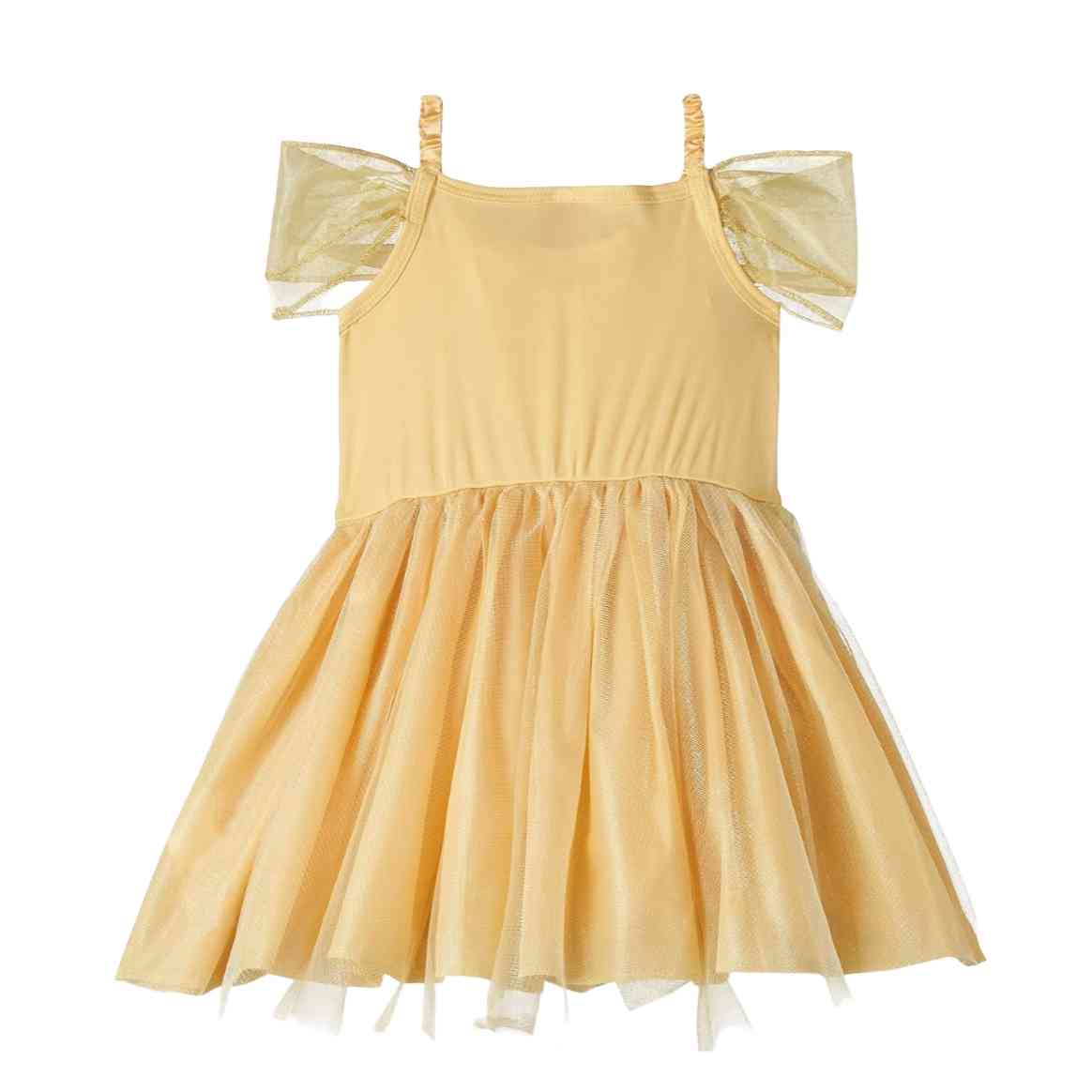 A golden ballerina dress inspired by Belle, with shimmering details, soft bodice, and layered tulle for a magical princess look. Great for parties, play, or photo-worthy costume fun.