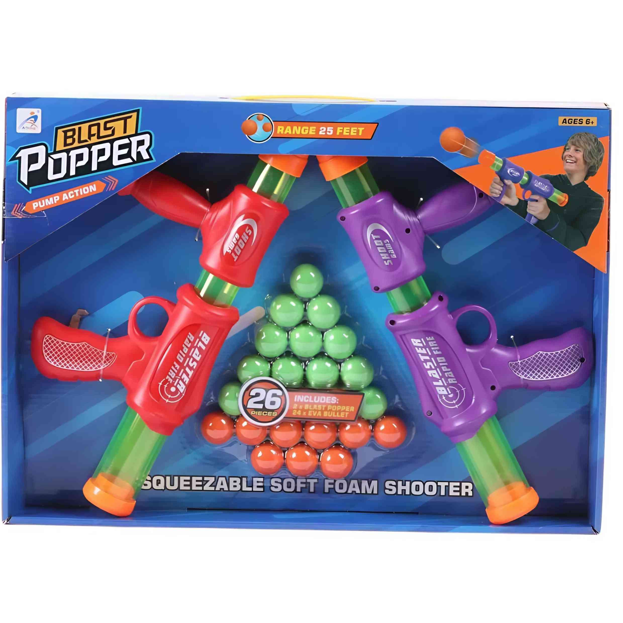 The Blast Popper Pump Action Soft Foam Shooter Set is an exciting toy blaster set that includes 2 popper guns and 24 soft foam balls. Designed for kids aged 6 and above, each shooter can fire foam balls up to 25 feet with simple pump action. Perfect for indoor and outdoor fun, it encourages active play and friendly competition.