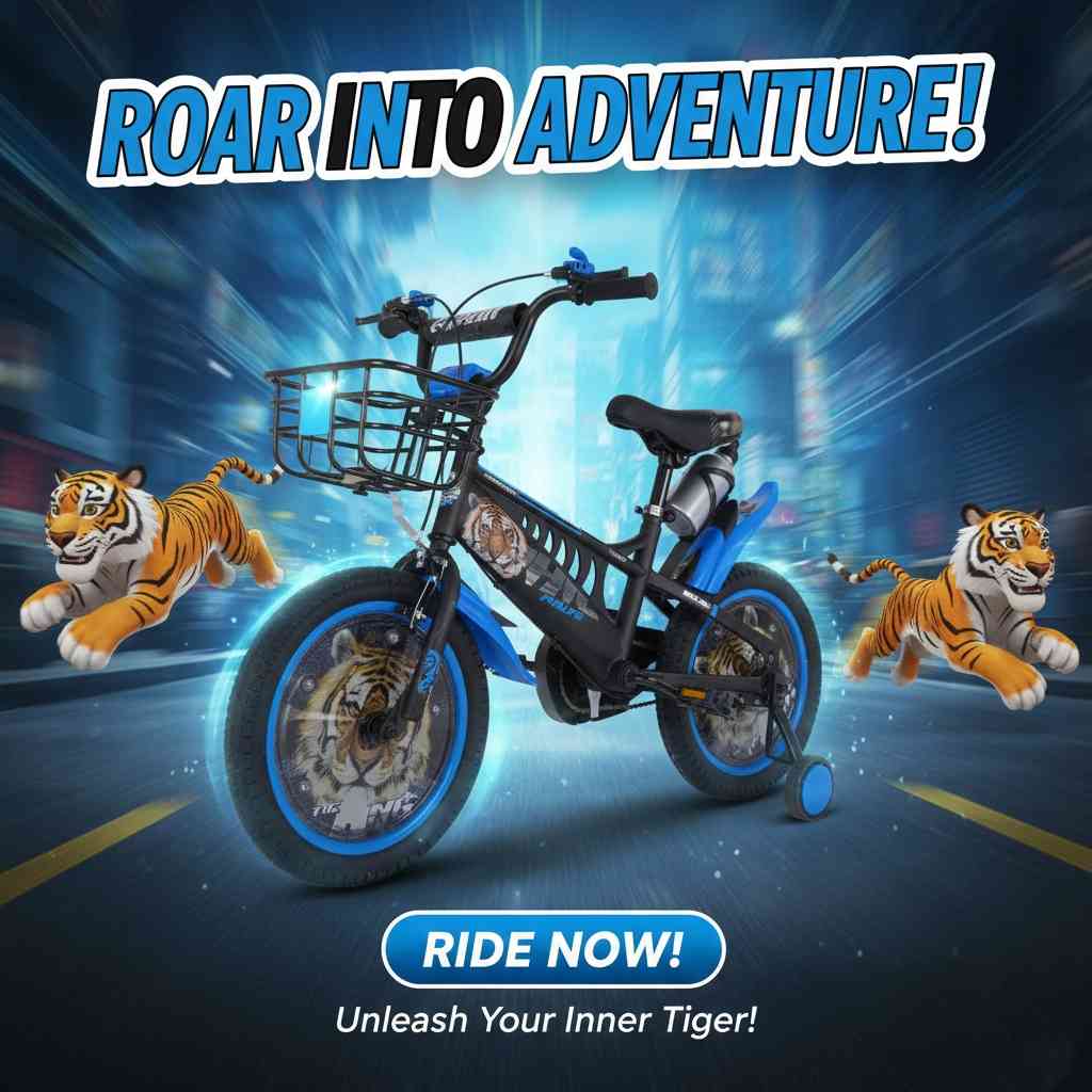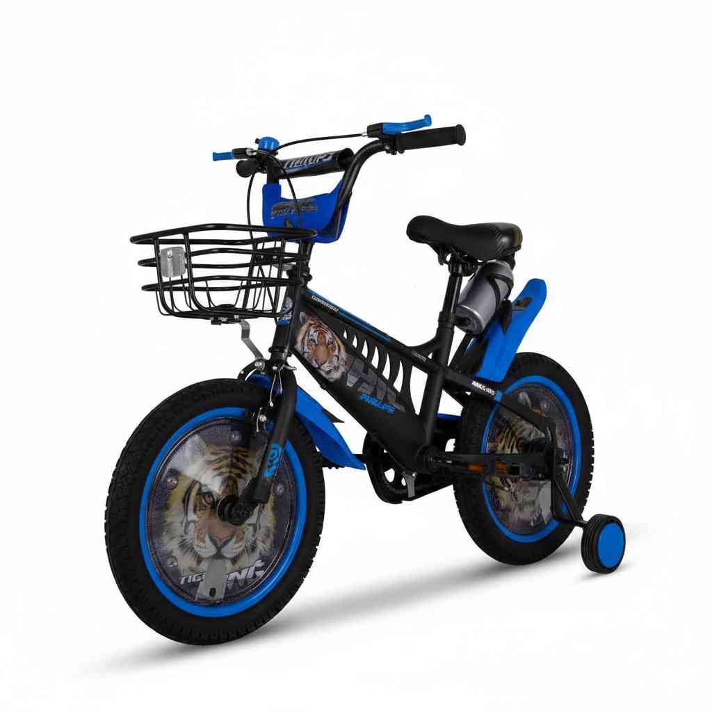 Bold and adventurous, this Blue Tiger kids’ bike features a sporty design with fierce tiger graphics, making it perfect for young riders who love excitement. It comes with training wheels for added stability and confidence while learning to ride.