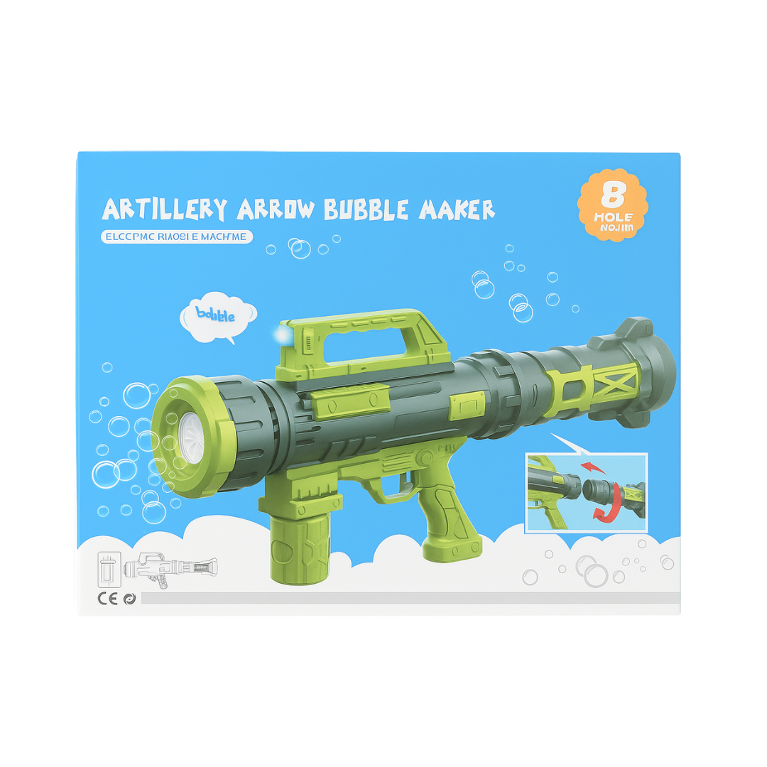 - Great electric bubble gun designed for kids. - Press the button to start continuous bubble shooting. - Includes 80ml bubble pack. - Suitable age group: 3 years and above. - Requires 3 "AA" batteries. (1.5V) (Not Included).