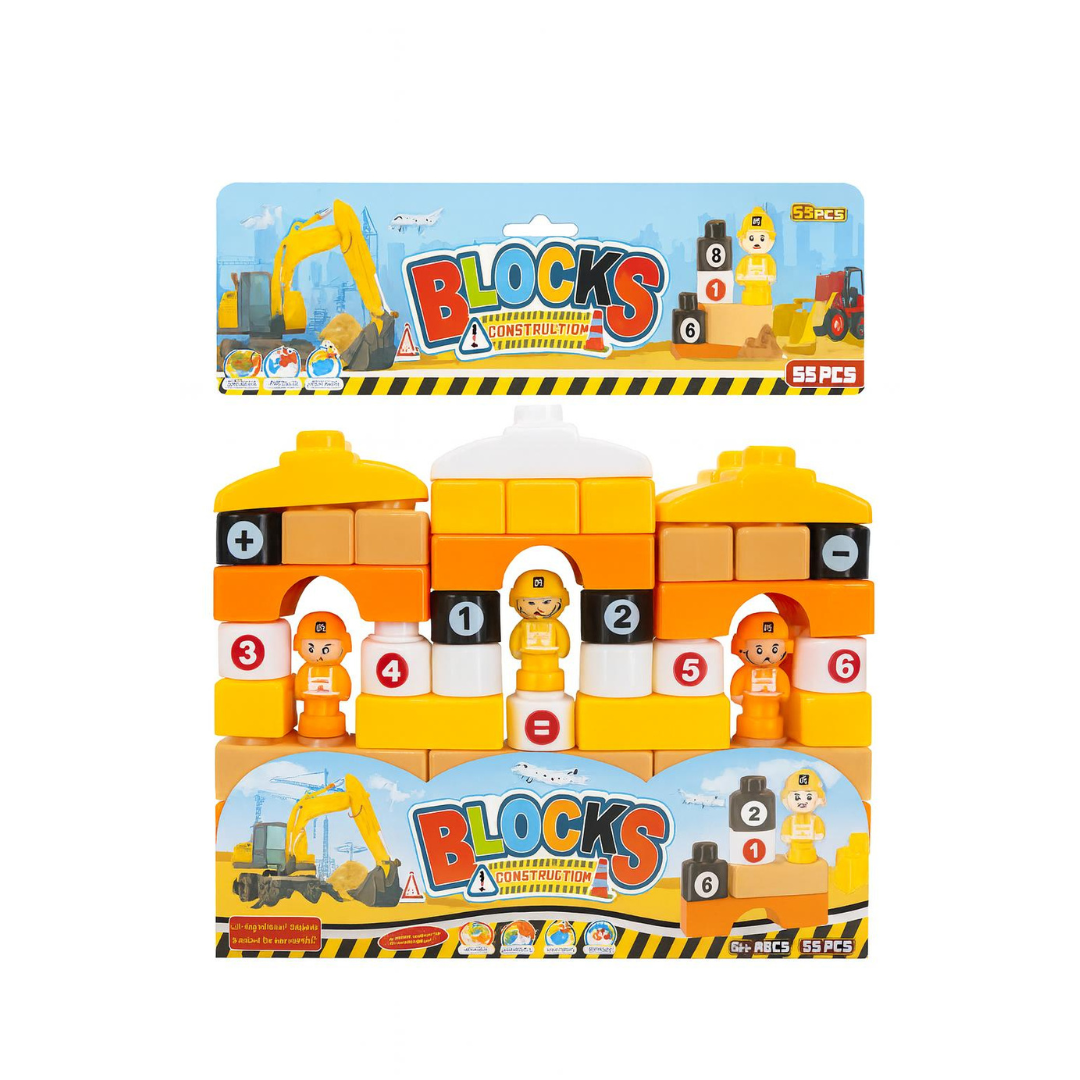 Fun 53-piece construction block set with builder figures, vehicles, and construction site accessories.