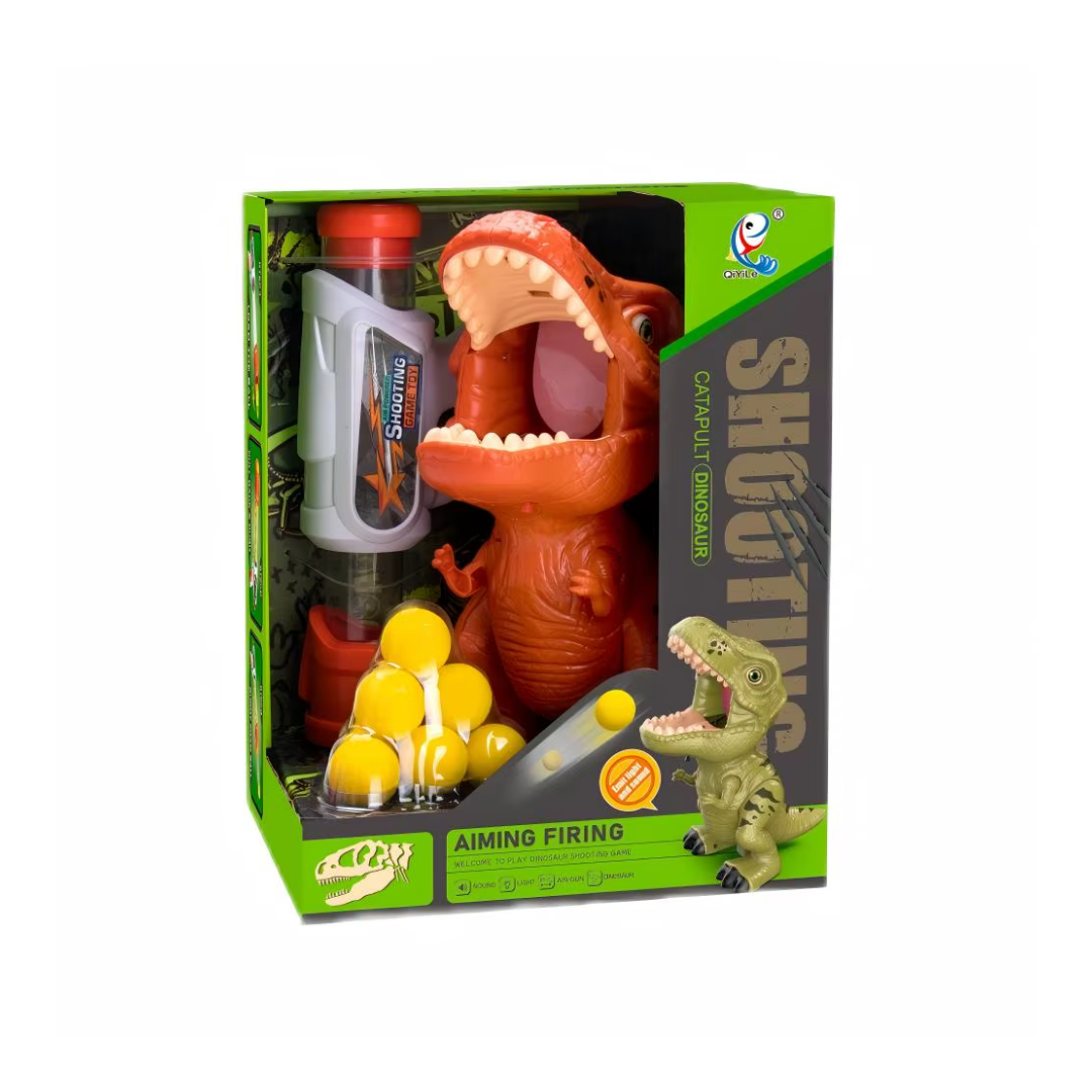 Exciting dinosaur shooting toy with 1 dinosaur target, 1 gun, and 10 soft balls. Sound and light when hitting the target.
