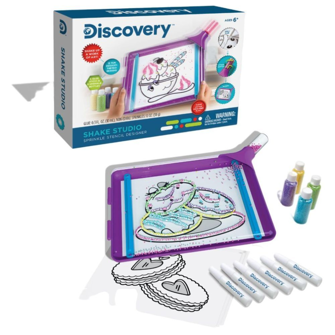 This is a creative art kit that allows kids to create unique works of art using the included stencils, sprinkles, glitter, and glue. 4 The kit includes a variety of supplies such as a sprinkle shaker, 5 spray bottles, 6 glue sticks, and 12 candy stencils that can be used to create vibrant and colorful art. 3 The board is double-sided, allowing kids to work on their creations from both sides.