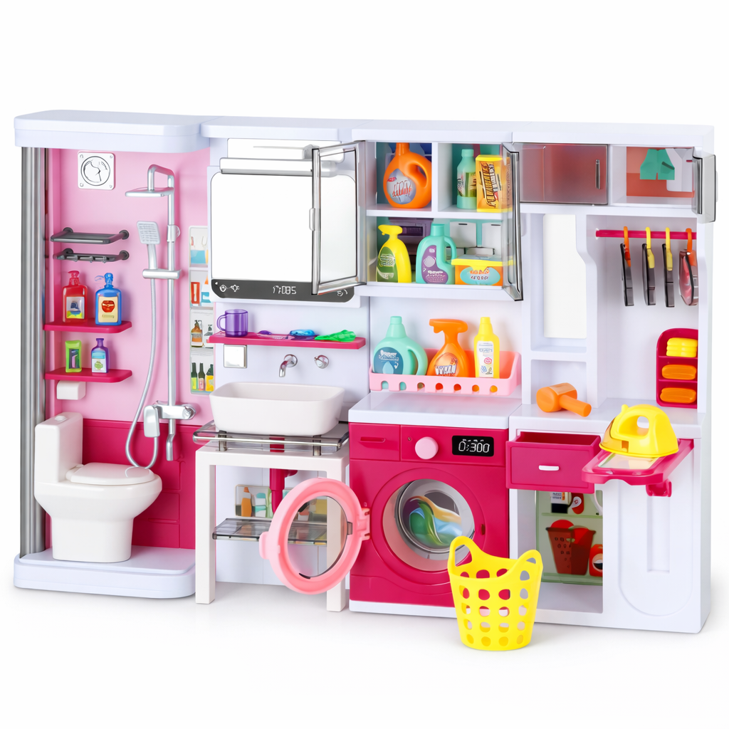 This beautiful bathroom playset lets children create realistic home role-play scenes with a fully equipped shower room and laundry area. It includes a toilet, sink with mirror, shower set, washing machine, storage cabinets, and various accessories such as detergent bottles, towels, baskets, and bathroom items. Designed in soft pink colors, it encourages imaginative play while helping kids learn about daily routines and organization.