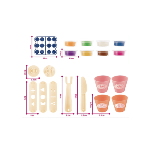 Complete accessory set including “Magic Clay” cups, spoons, and plastic knives for shaping and decorating.