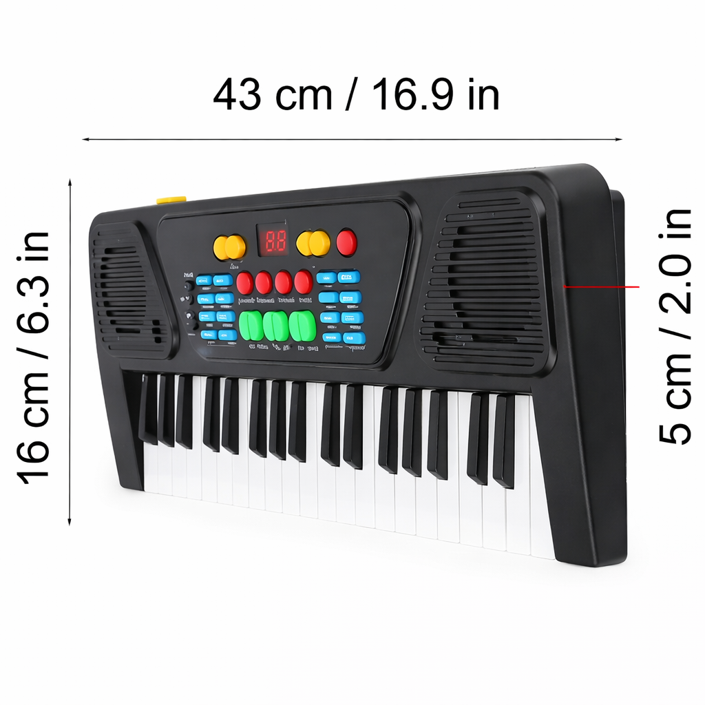 This compact electronic piano is a perfect introduction to music for young children. Featuring 37 responsive keys, multiple sound effects, rhythms, and built-in demo songs, it allows kids to explore melodies, chords, and beats in a fun and interactive way. The keyboard includes volume control, recording and playback functions, and a microphone input for singing along, helping develop musical creativity, coordination, and listening skills from an early age.