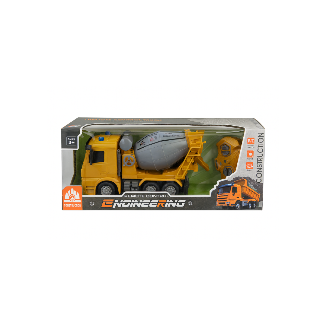 Realistic RC cement mixer truck (37.5cm) with full functions: forward, reverse, left, right, and stop. Features a rotating mixer barrel.