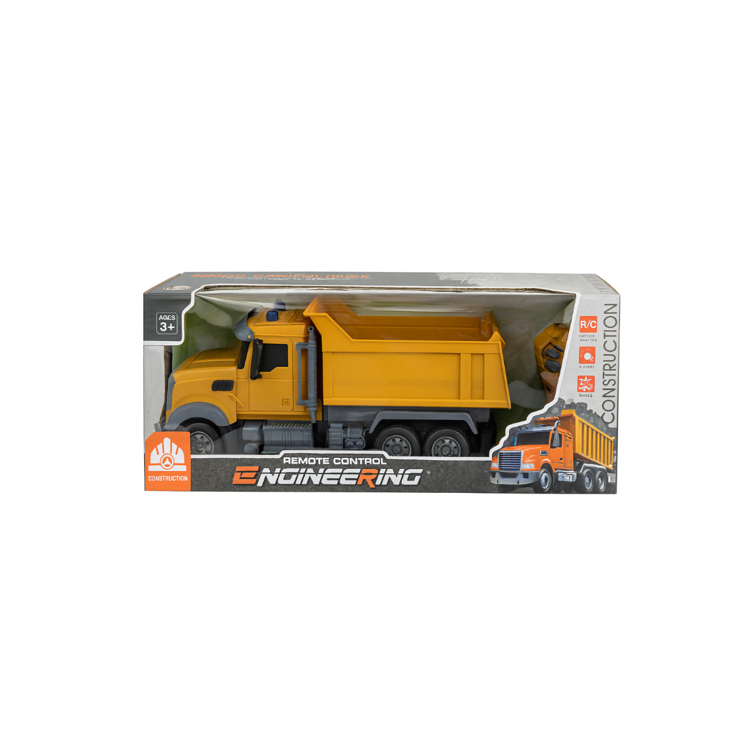 Realistic RC dump truck (37.5cm) with full functions: forward, reverse, left, right, and stop. Features a tipping dump bed.