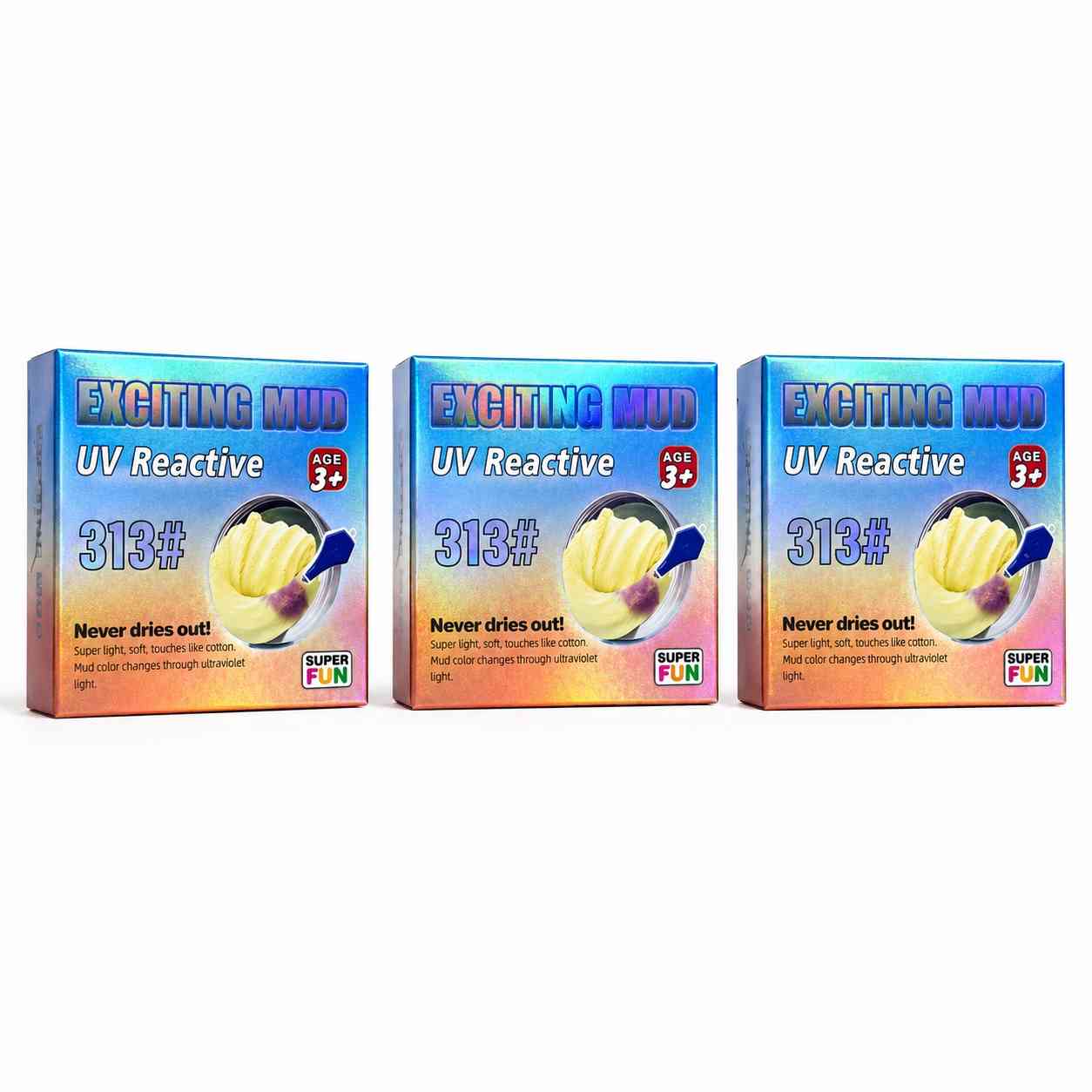 • UV Reactive: This exciting mud changes color or glows under UV light, adding a fun and magical effect during play.