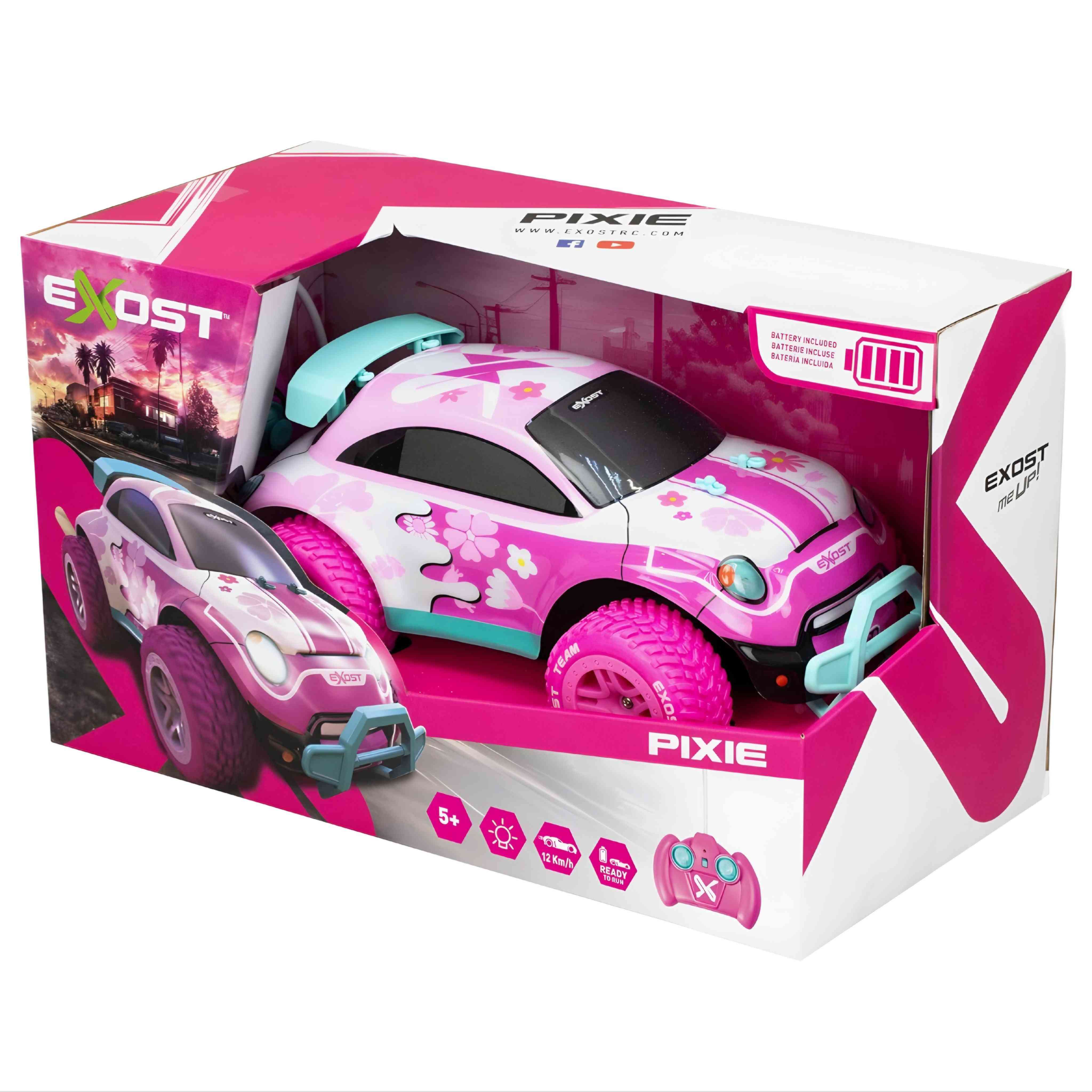 The EXOST PIXIE II is a remote-controlled car marketed primarily towards young girls. Based on the search results, it appears to be a highly stylized and decorative car model with a distinctive pink and floral design.