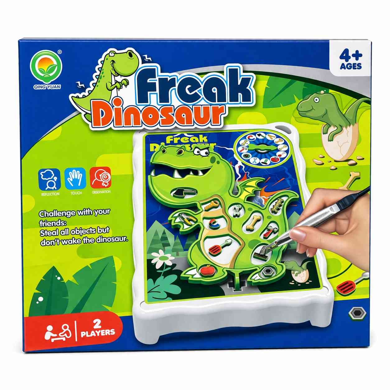 Spin the wheel and whatever arrow appears the player must use the tweezers to steal the item from the dinosaur. The goal is to steal all the items and not wake the dinosaur, whoever wakes the dinosaur loses.