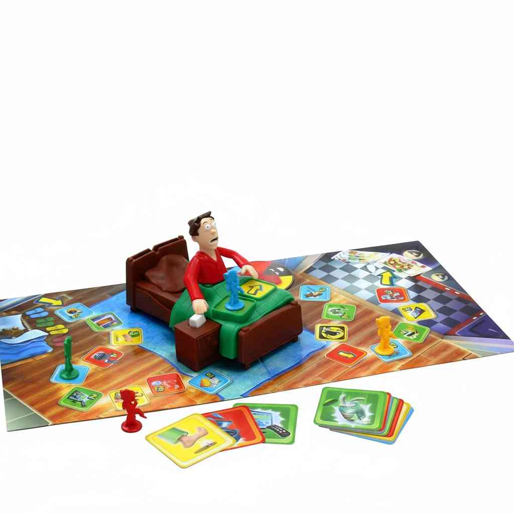 The game is designed for 2-4 players, ages 5 and up. The set includes a game board depicting a bedroom scene with a bed where the sleeping Dad figure is placed, 4 playing pieces representing the children, a spinner card, and 16 cards that players use to navigate the obstacles in the room.