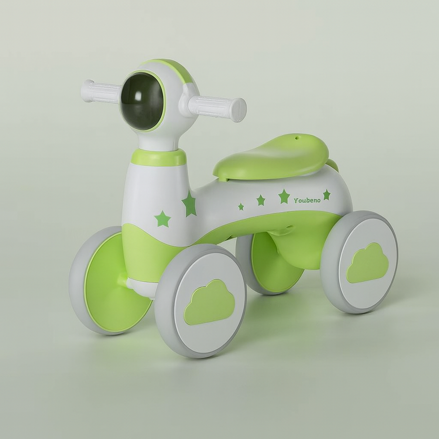 Let your little adventurer roll into fun with the Green Cloud Rider Baby Balance Bike! Featuring a cheerful green and white design with glowing star lights and cute cloud accents, this balance bike encourages toddlers to build coordination, balance, and confidence. Its stable four-wheel structure, smooth ride, and comfy seat make it ideal for both indoor and outdoor play.