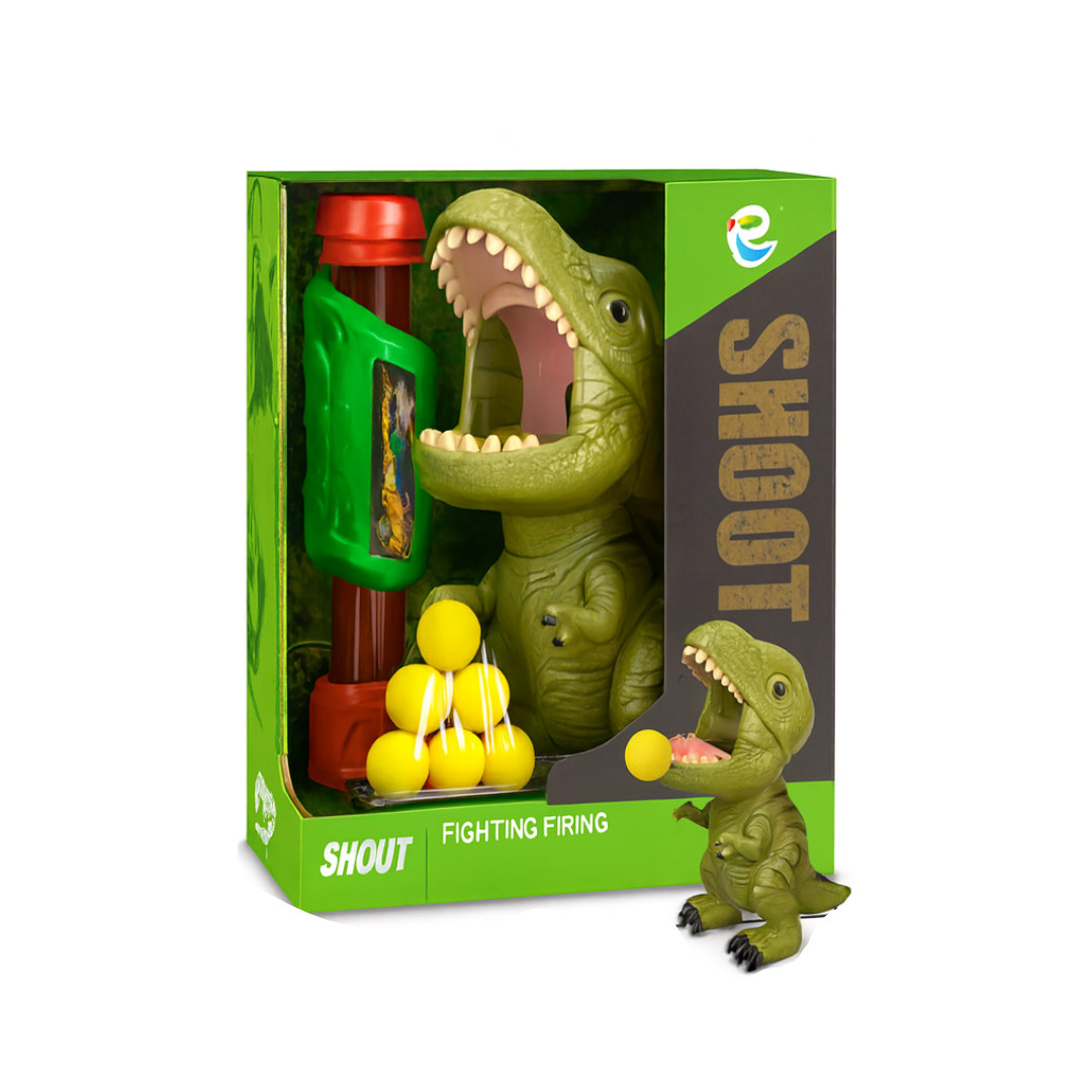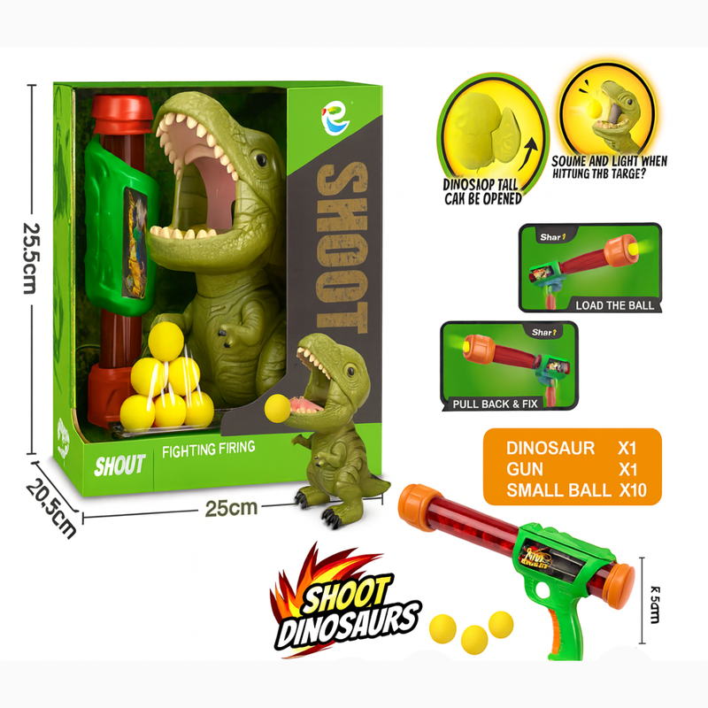 Exciting dinosaur shooting game with 1 dinosaur target, 1 toy gun, and 10 soft balls. Features sound and light when hitting the target.