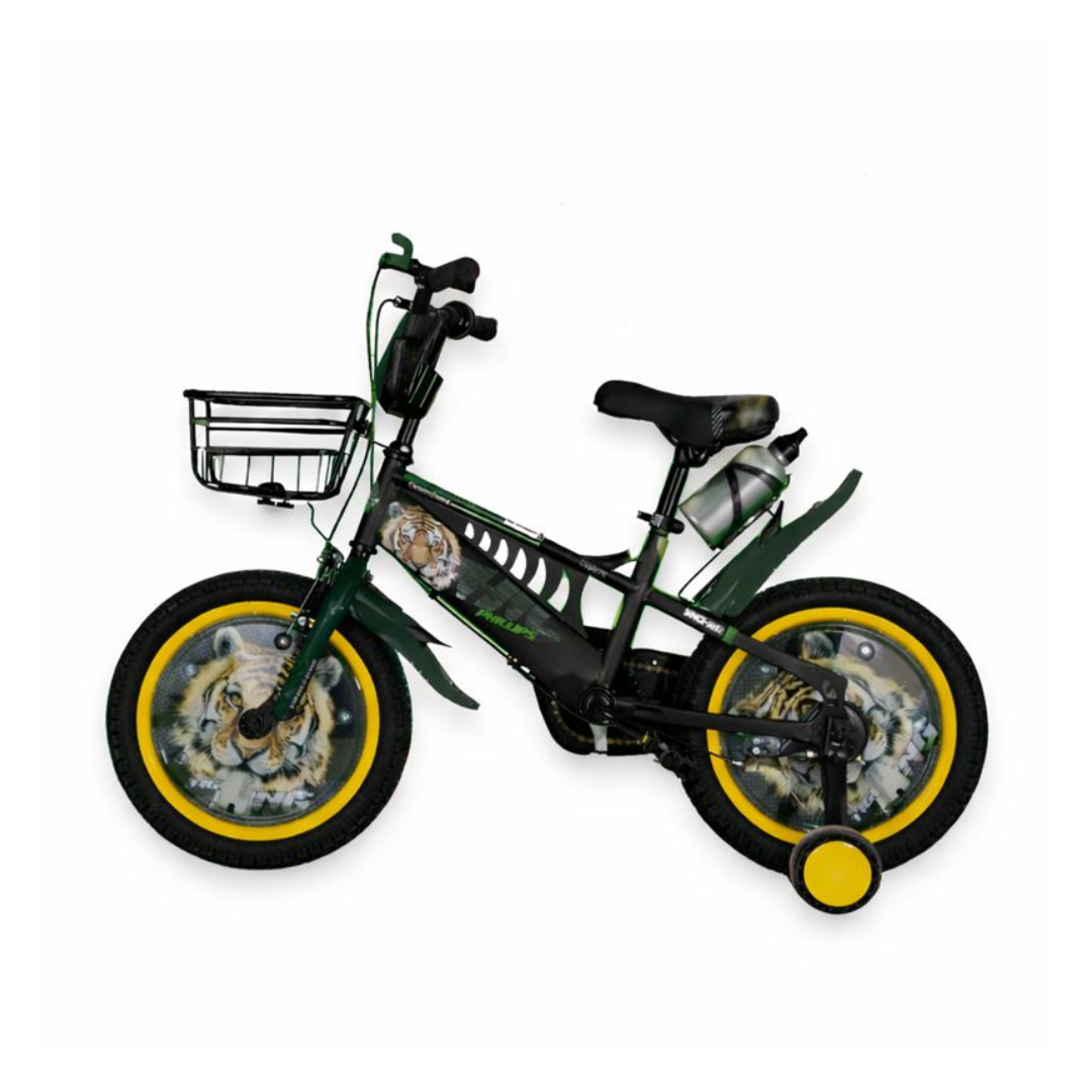 Bold and adventurous, this Green Tiger kids’ bike features a sporty design with fierce tiger graphics, making it perfect for young riders who love excitement. It comes with training wheels for added stability and confidence while learning to ride.