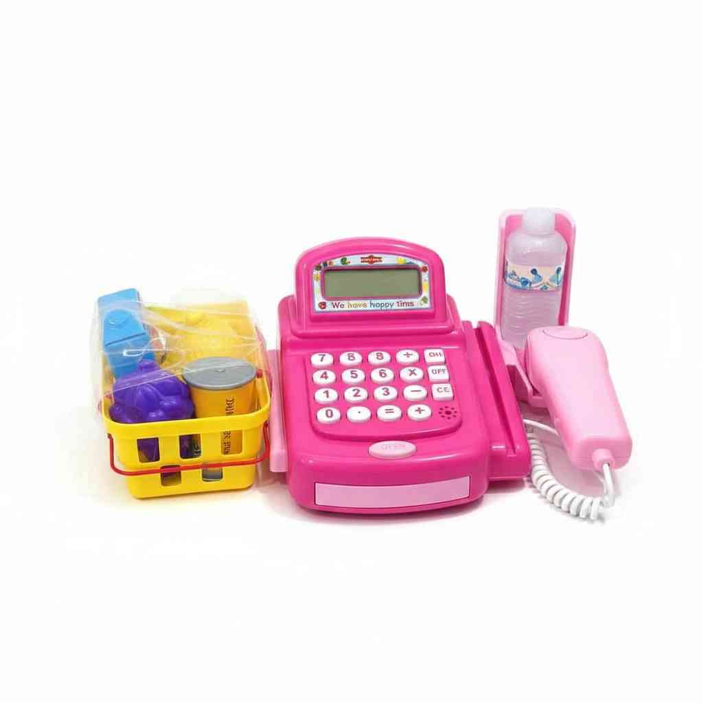 Let your child enjoy a realistic shopping role-play experience with this pink cashier desk playset. It includes a cash register with display and calculator buttons, a scanner, a card machine, and a shopping basket with items.