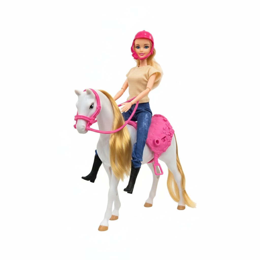 Riding Horse Barbie with a stylish white horse and a beautifully detailed pink saddle. Suitable for children aged 3 and up, encouraging imaginative and creative play.