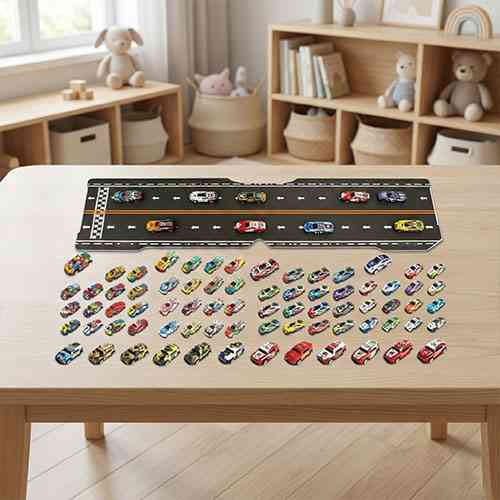 Let your child dive into the world of racing and challenges with this colorful toy car set.