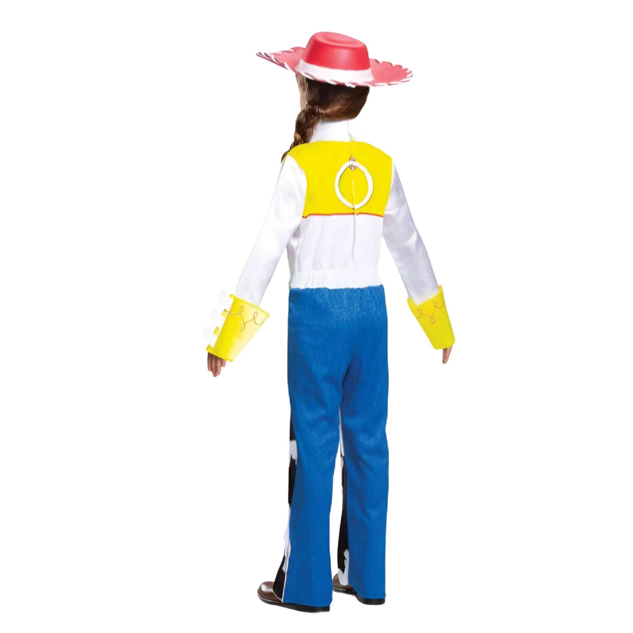 The Child Jessie Deluxe Costume 3T-4T is a costume inspired by the character Jessie from the Toy Story franchise. The costume includes a printed blue and white jumpsuit with buttons, a screen printed belt buckle, attached cuffs, and Jessie's signature cow print pattern.It also comes with a cute hat. The costume is designed for children in the 3T-4T size range.