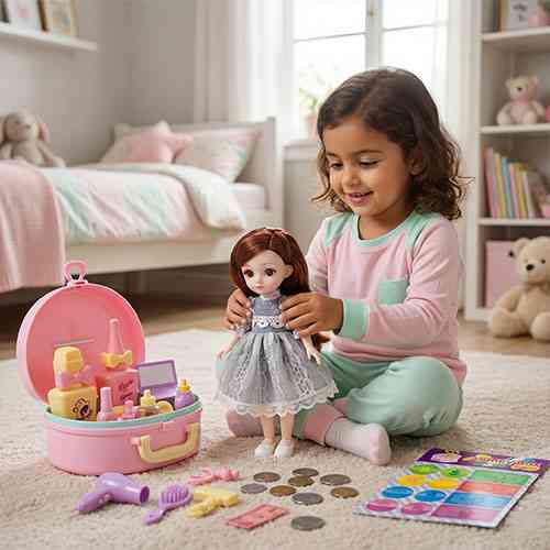 The Princess Doll & Piggy Bank Set is a special gift that combines the joy of playing with an elegant doll and learning the value of saving money from an early age.