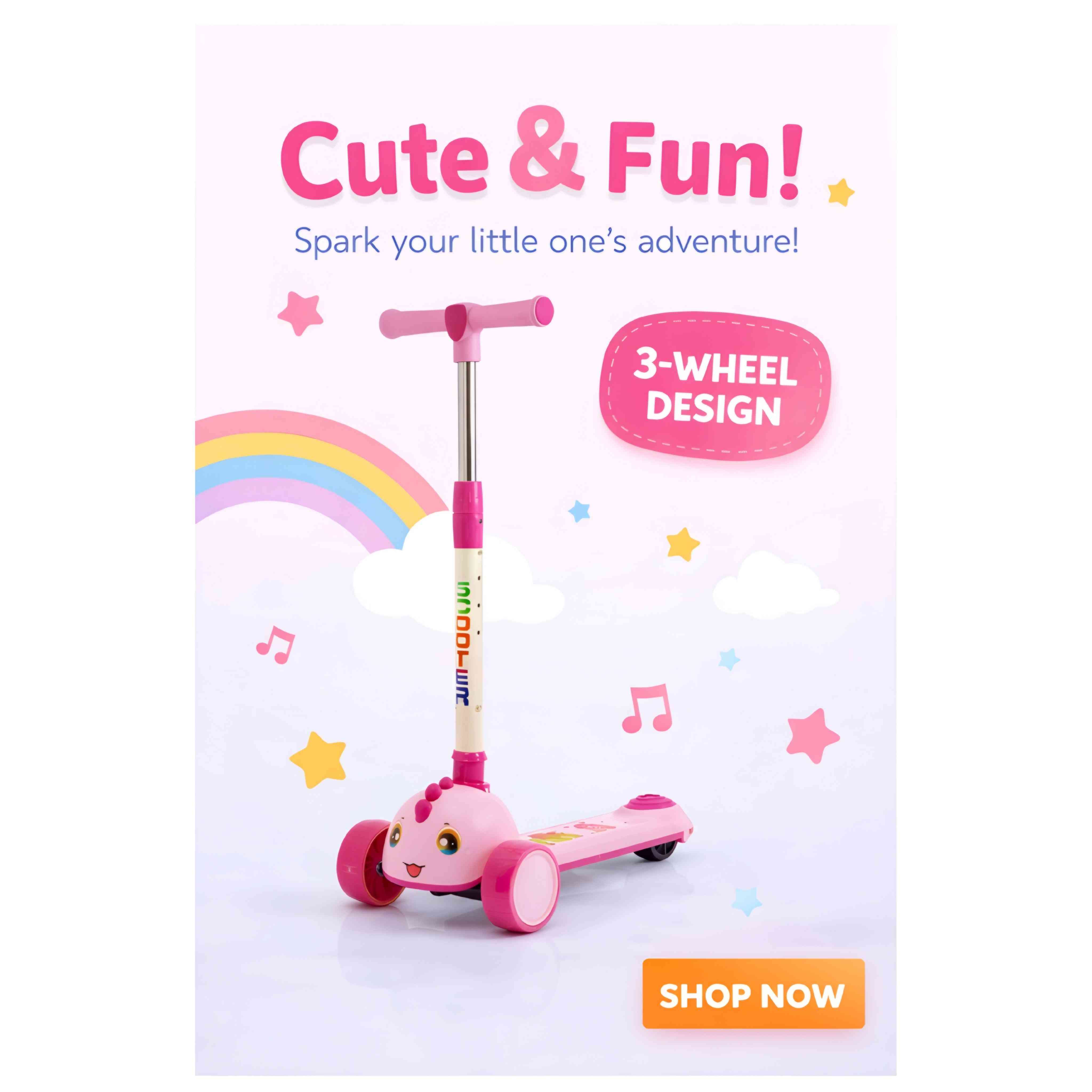 The scooter offers smooth and easy control, allowing young riders to steer comfortably and confidently. Equipped with built-in lights and music, it transforms every ride into an entertaining and lively experience. Made from durable, child-safe materials, it ensures both safety and long-lasting use.