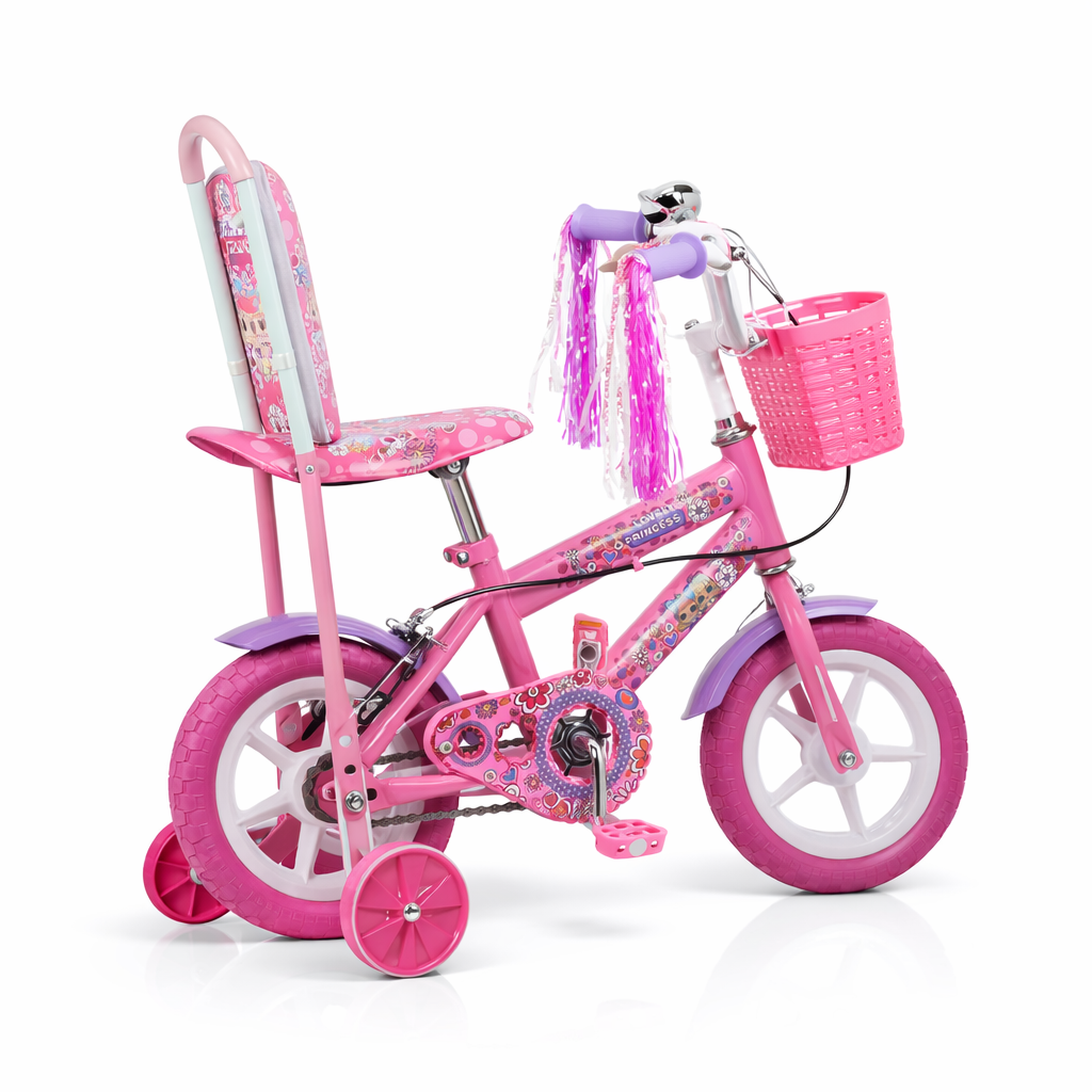 A charming pink kids’ bicycle featuring lovely princess-themed prints, designed for fun, comfort, and safety. It includes a comfortable seat with a supportive backrest, along with training wheels to help beginners ride confidently.