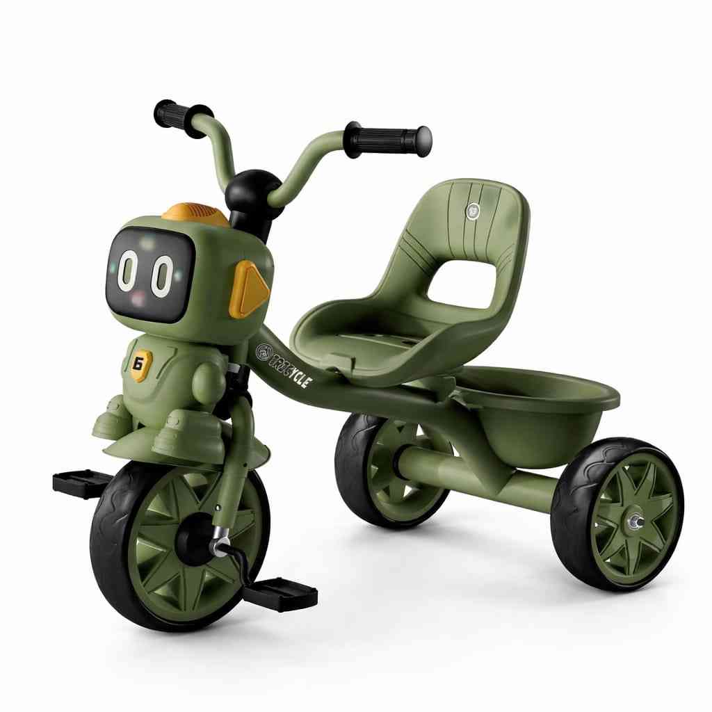 This Kids Robot Design Tricycle features a unique robot-themed front design and a stylish green color that makes it exciting for children.