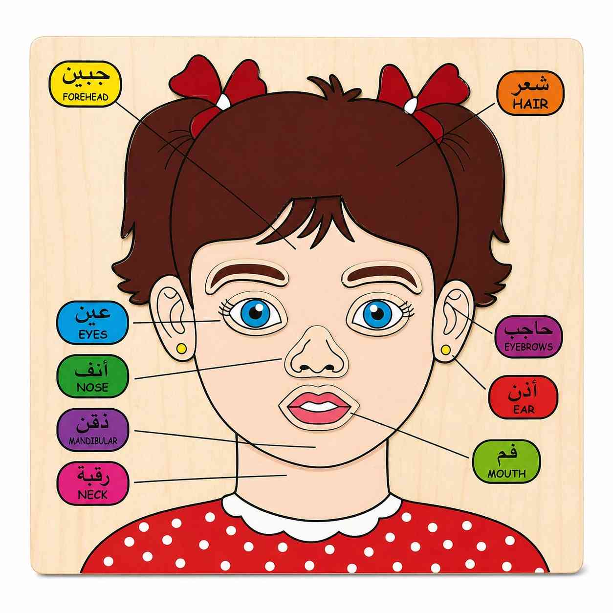 This wooden board helps children learn face parts in both Arabic and English in a simple and engaging way.