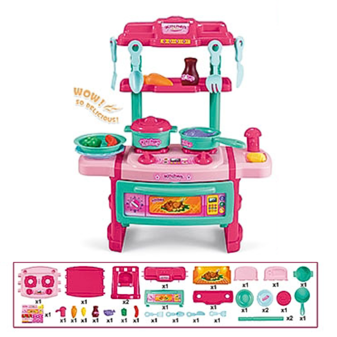 Colorful 30-piece pink kitchen play set with stove, pots, utensils, plates, and food. Features light and sound effects for role play.