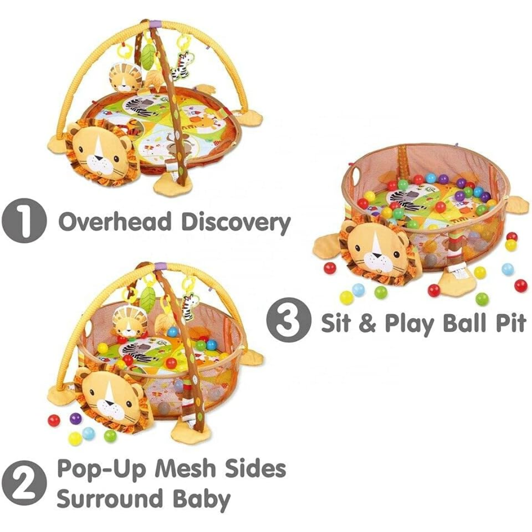 A soft baby play gym with jungle-themed hanging toys and colorful balls. Helps babies develop motor skills and enjoy sensory play in a cozy environment.
