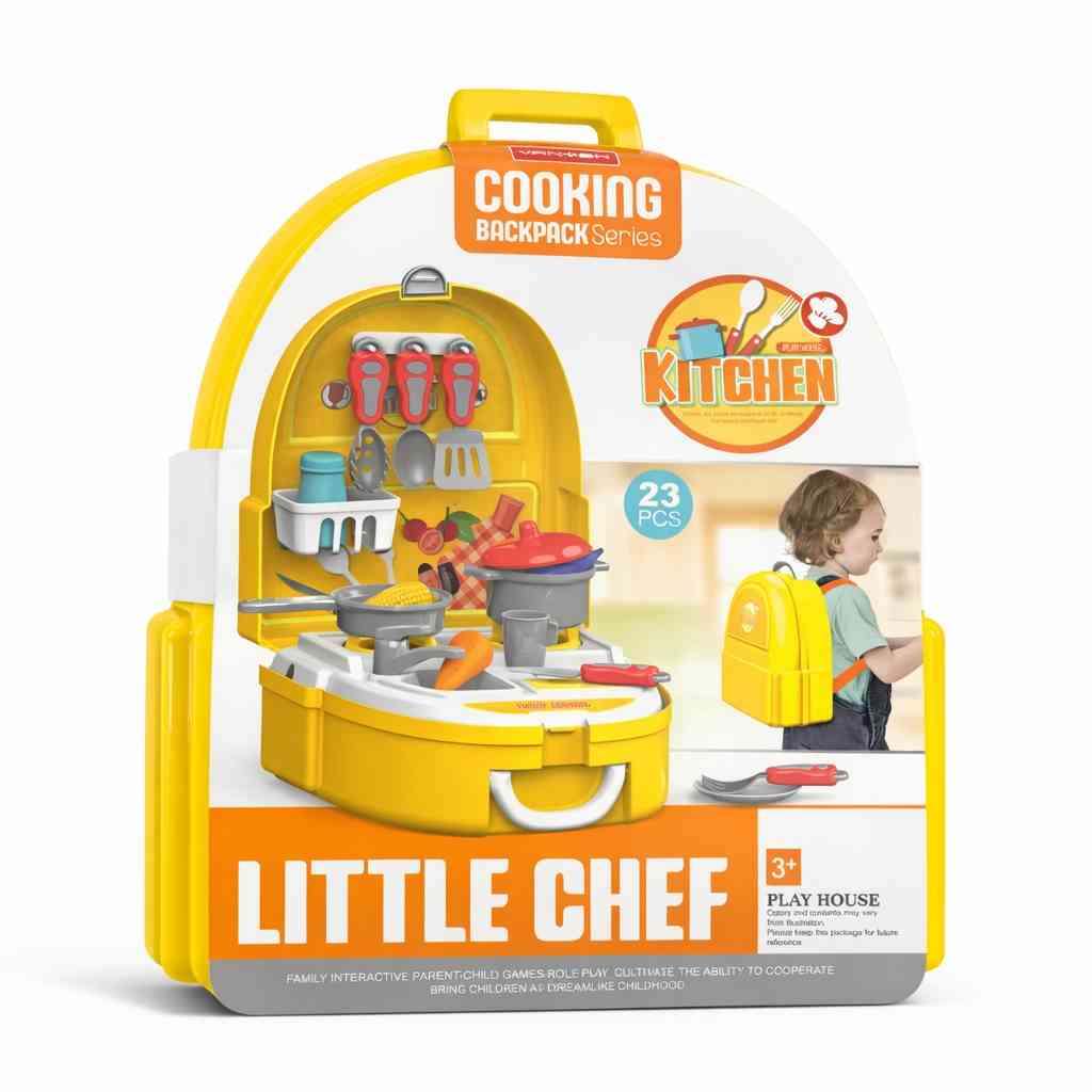 Let your child become a little chef with this fun and practical cooking backpack! The backpack opens into a complete mini kitchen playset filled with cooking tools and accessories.