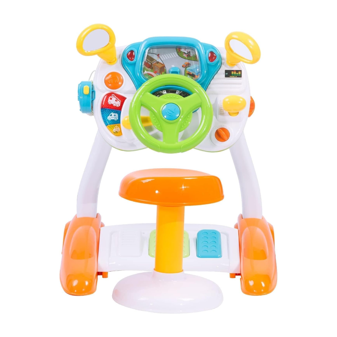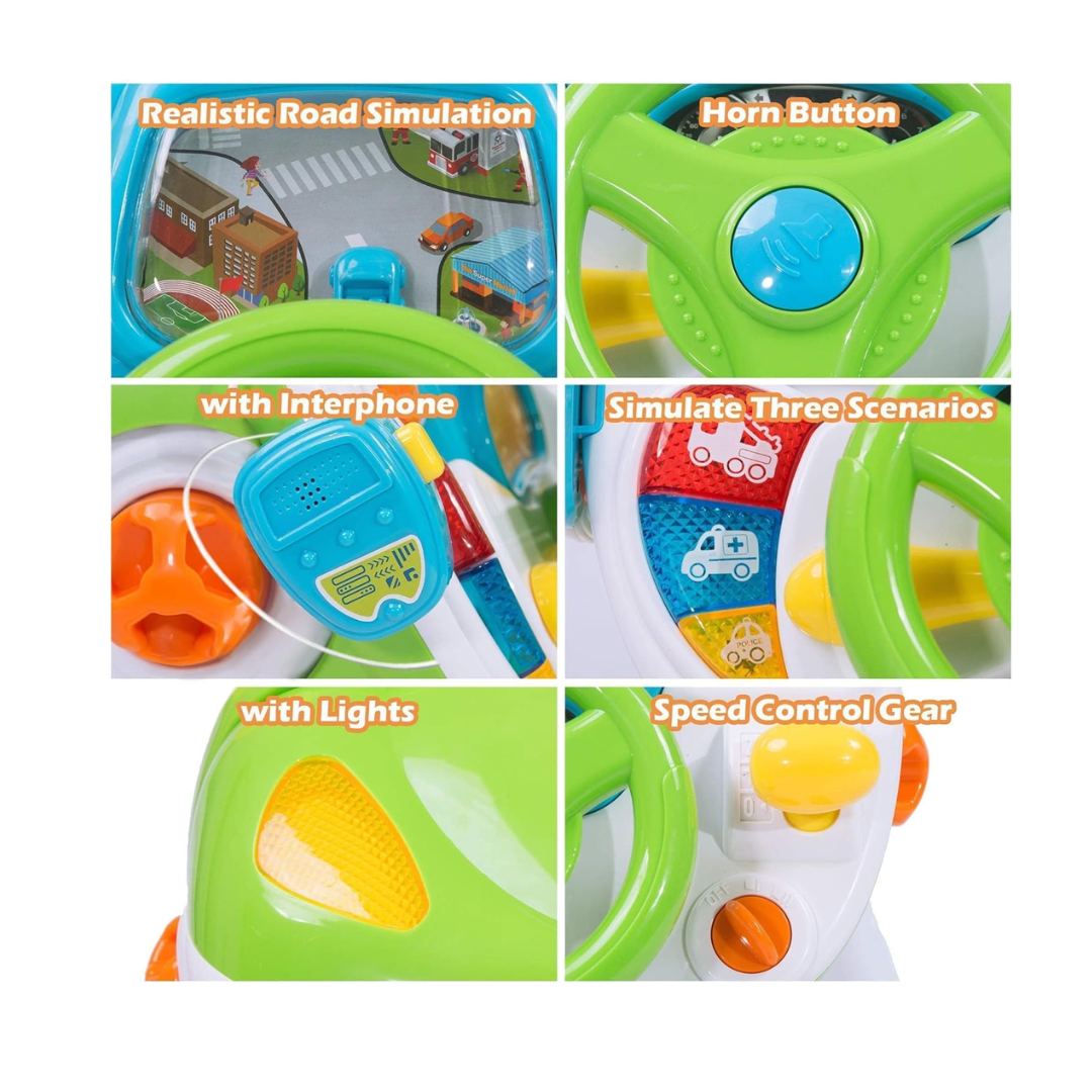 The Little Driver Interactive Steering Playset lets toddlers experience the fun of driving in a safe and playful way. Designed like a real car dashboard, it features a steering wheel with horn, light-up effects, realistic road simulation, an interphone, and a speed control gear. With three different driving scenarios, children can enjoy role-play while developing coordination and sensory skills.