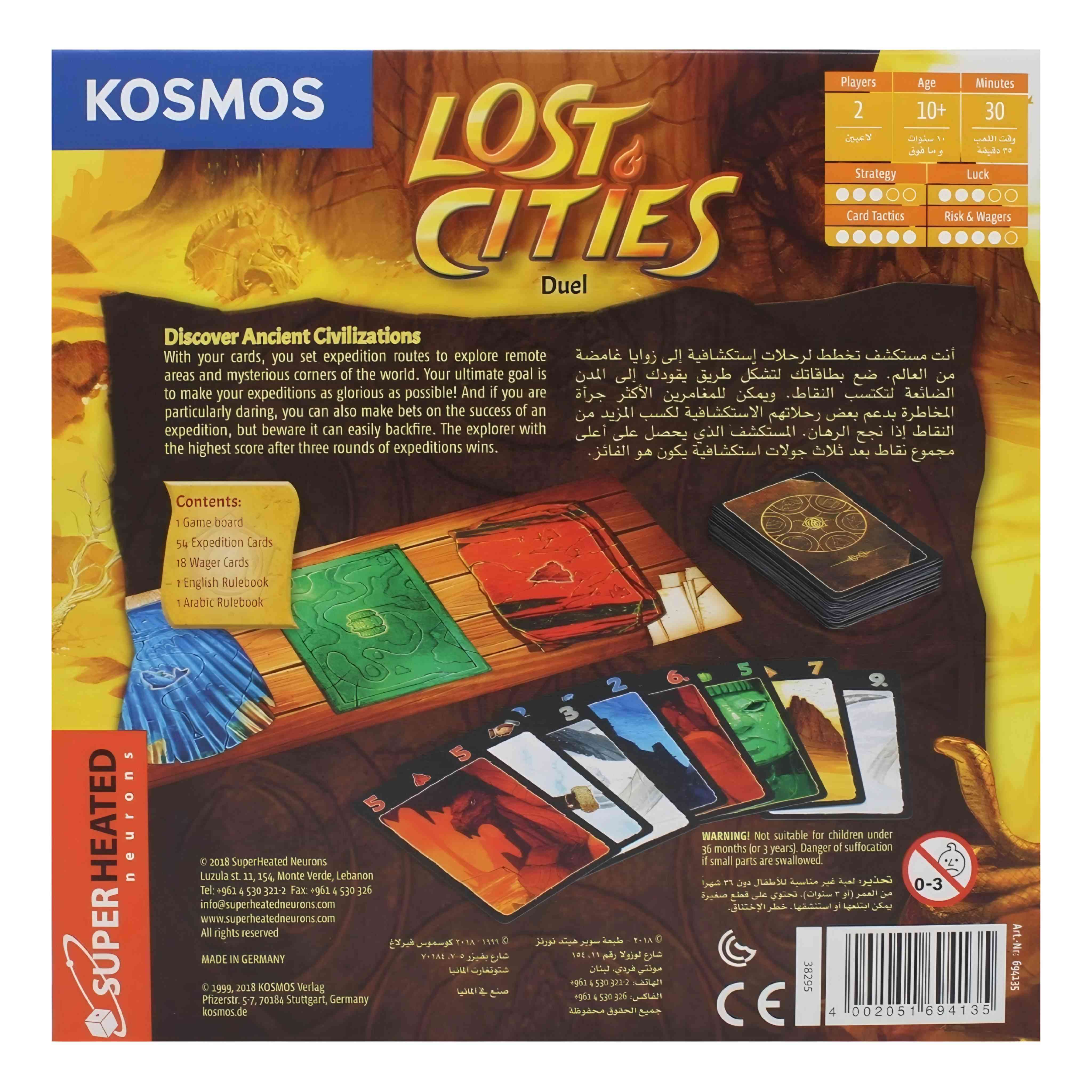 Lost Cities: Duel is an exciting 2-player strategy card game that takes you on thrilling expeditions to discover legendary ancient cities. Designed by the renowned game designer Reiner Knizia, this duel version offers fast, competitive, and highly tactical gameplay, perfect for couples, friends, and family game nights.