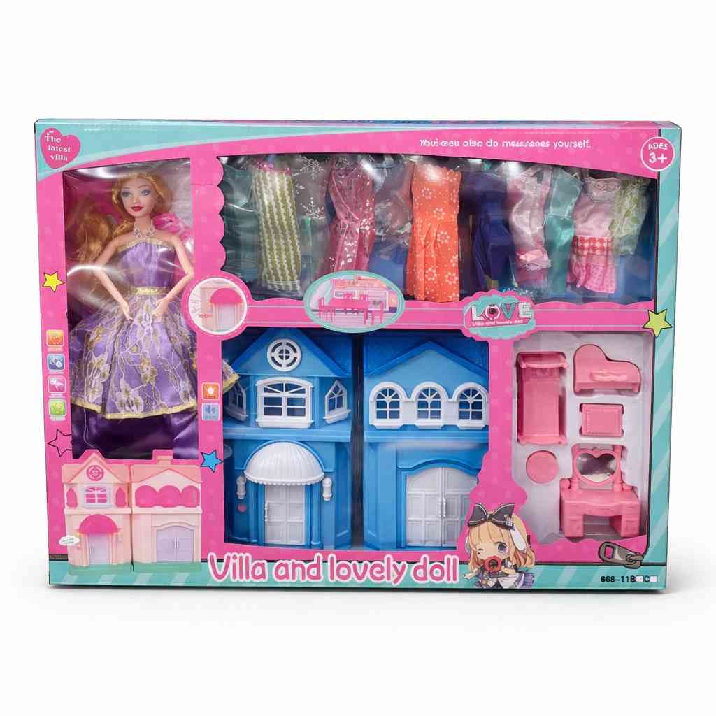 This Villa & Lovely Doll Playset includes a beautiful doll, a stylish house (villa), and multiple dresses and accessories for endless imaginative play.
