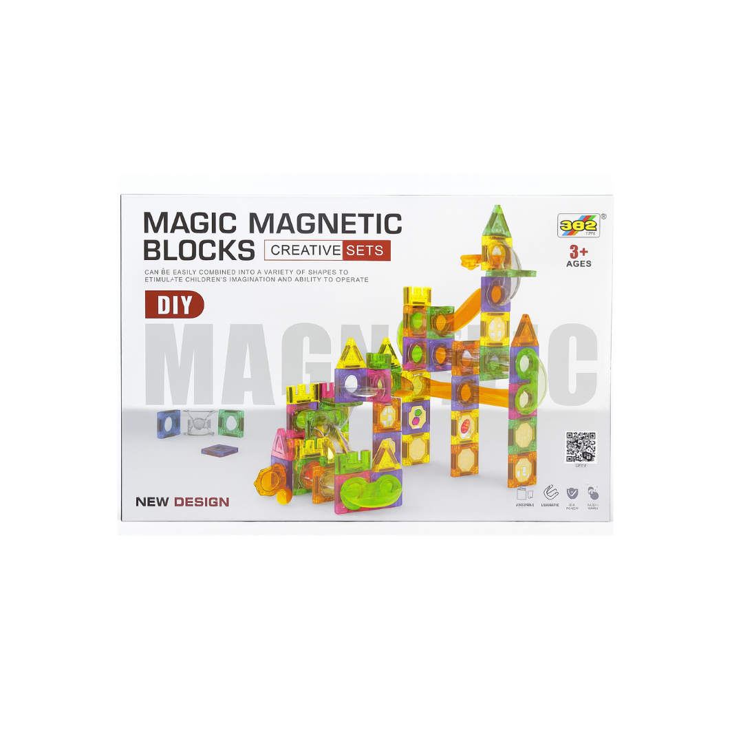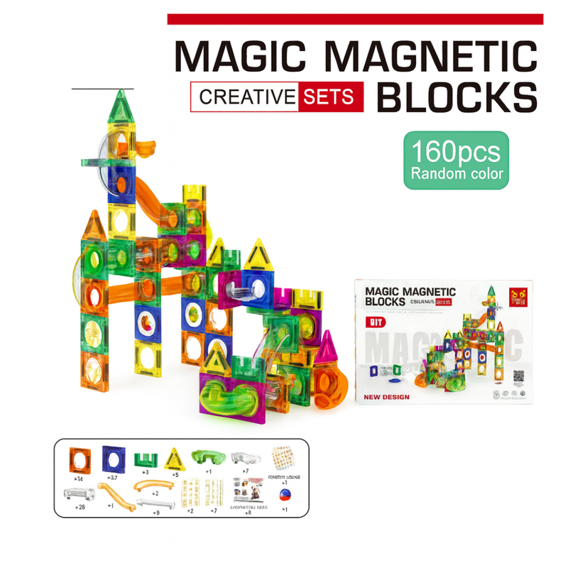 Large 160-piece magnetic building block set with colorful tiles, shapes, and tracks. Perfect for big builds.