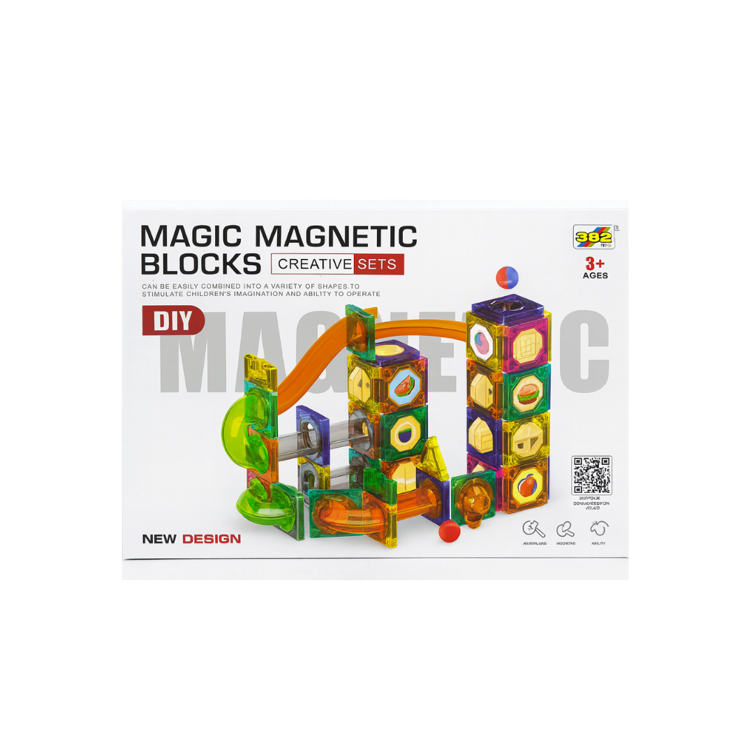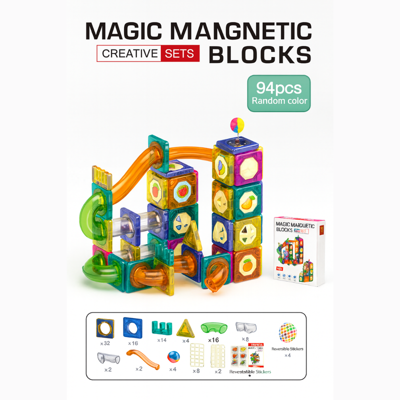 Colorful 94-piece magnetic block set with tiles, shapes, and track parts. Encourages creative play.