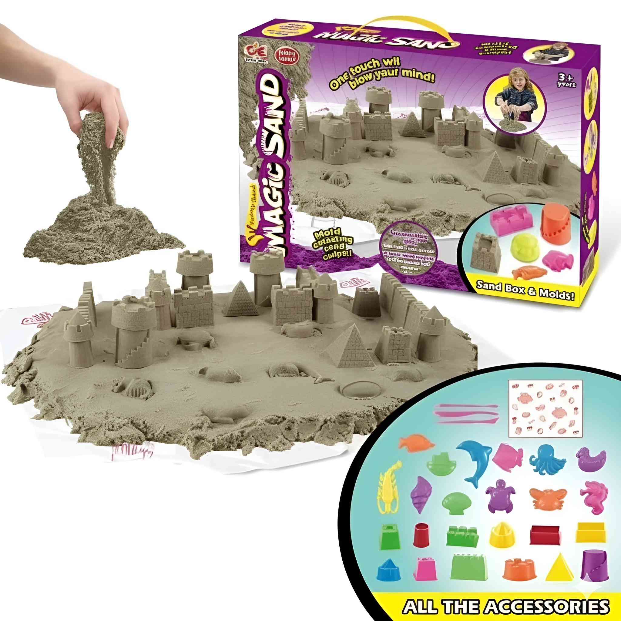 Magic sand with accessories for endless shaping and molding fun.