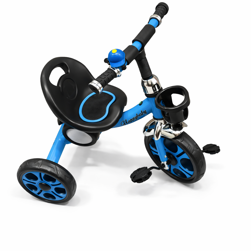 A stylish and practical tricycle in blue with black accents and chrome details, designed to provide a safe and enjoyable riding experience for toddlers.