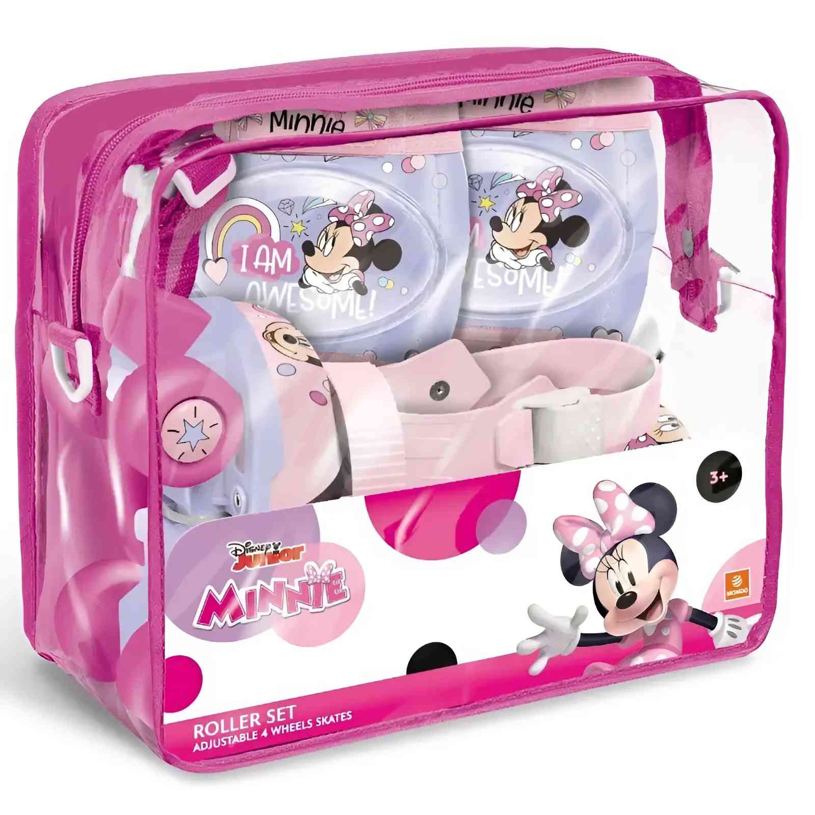 The MONDO Roller 4WH Minnie Skates Set is a comprehensive roller skating package designed for young girls that features a range of protective gear and adjustable skates.