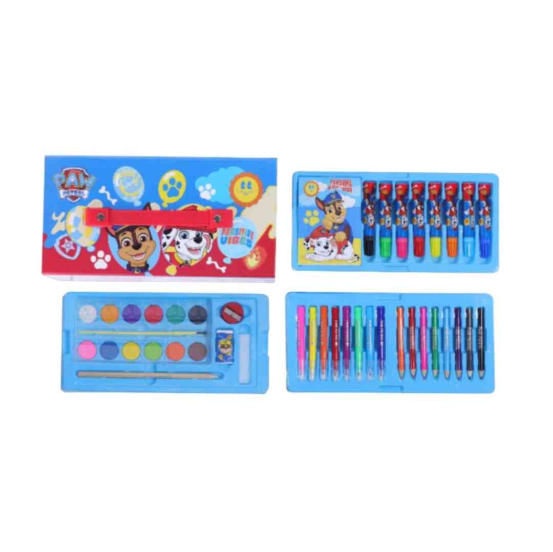 The PAW Patrol colouring case is a set designed to help grow a child's creative skills and provide endless hours of fun. The set includes a variety of art supplies such as mini markers, mini colouring pencils, water-based paints, paint brushes, and colouring sheets 12345. The case is designed with a PAW Patrol theme, featuring the popular Nickelodeon cartoon characters 5. The set is suitable for boys and can be delivered within 6-8 days 4. Overall, this colouring case is a great way to encourage children's creativity and engagement with the PAW Patrol brand.