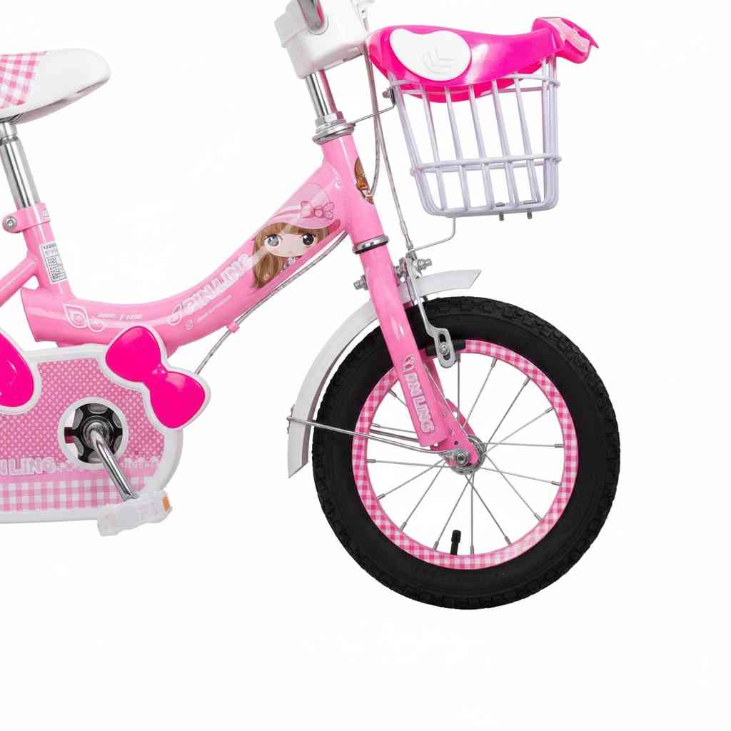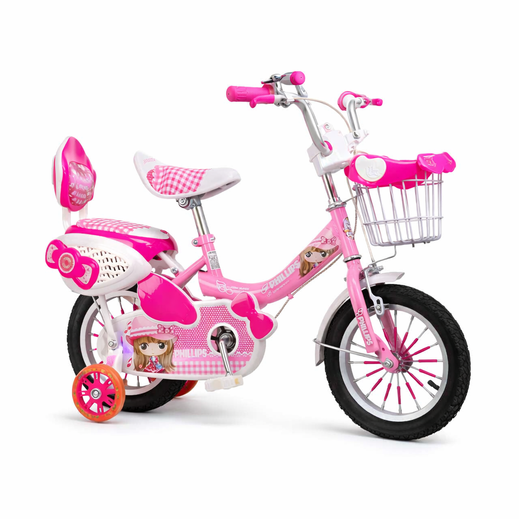 The bike comes equipped with sturdy removable training wheels that provide excellent balance and stability, helping beginners ride with confidence. A front basket allows kids to carry their favorite toys or personal items, while the rear doll seat adds extra fun, making every ride more imaginative and enjoyable.