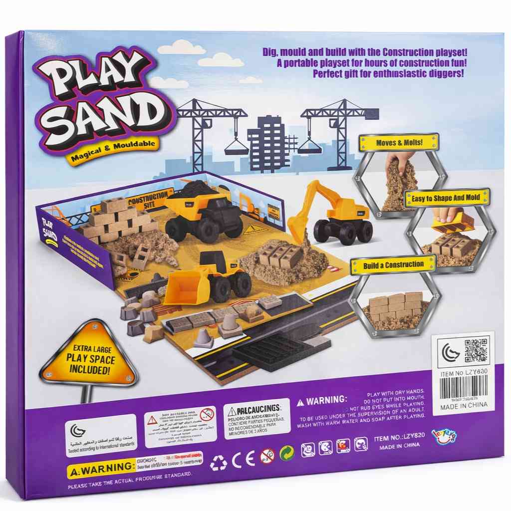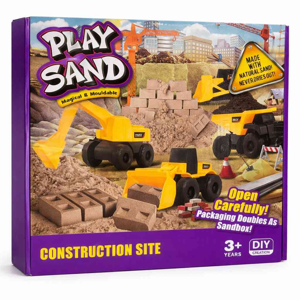 An exciting and interactive construction-themed playset featuring magical mouldable play sand that lets kids dig, build, and create like a real construction site. The set includes construction vehicles and brick moulds, offering hours of creative and hands-on fun.