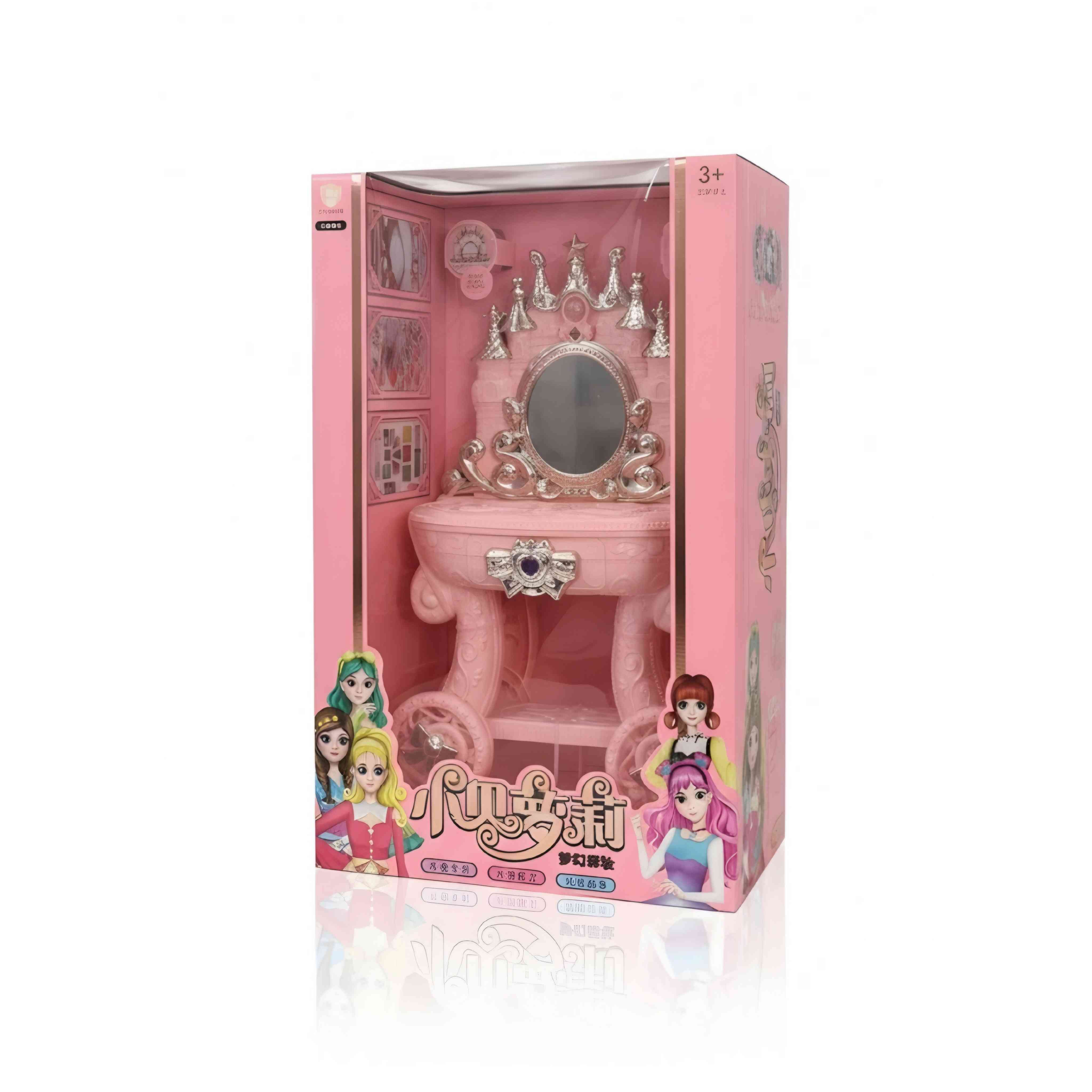 A dreamy pink vanity table with a sparkling mirror and accessories. Perfect for little girls to enjoy pretend beauty time like a real princess.