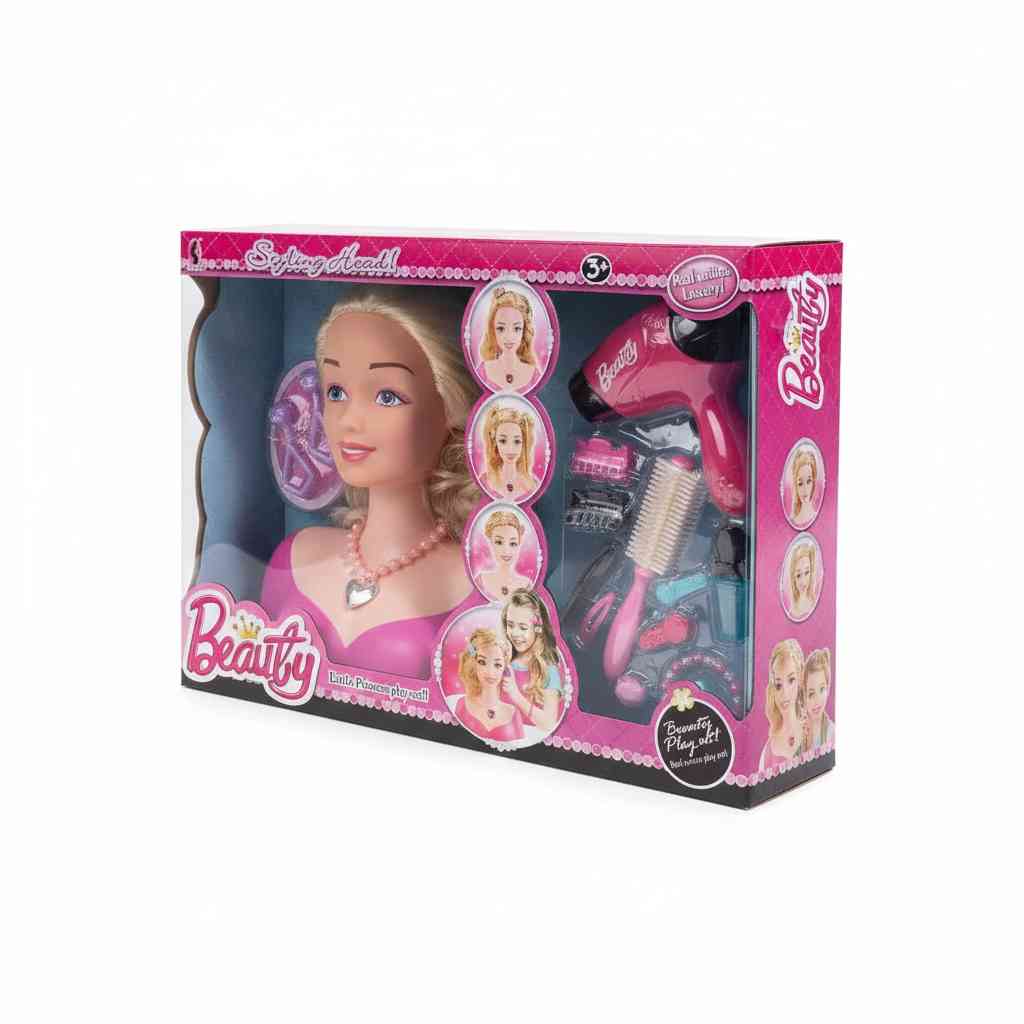 Let your little one enjoy hours of creative fun with the Princess Hair Stylist Play Set. This beautiful styling head comes with soft, brushable hair and a complete set of accessories, including a toy hair dryer, brush, clips, and decorative pieces.
