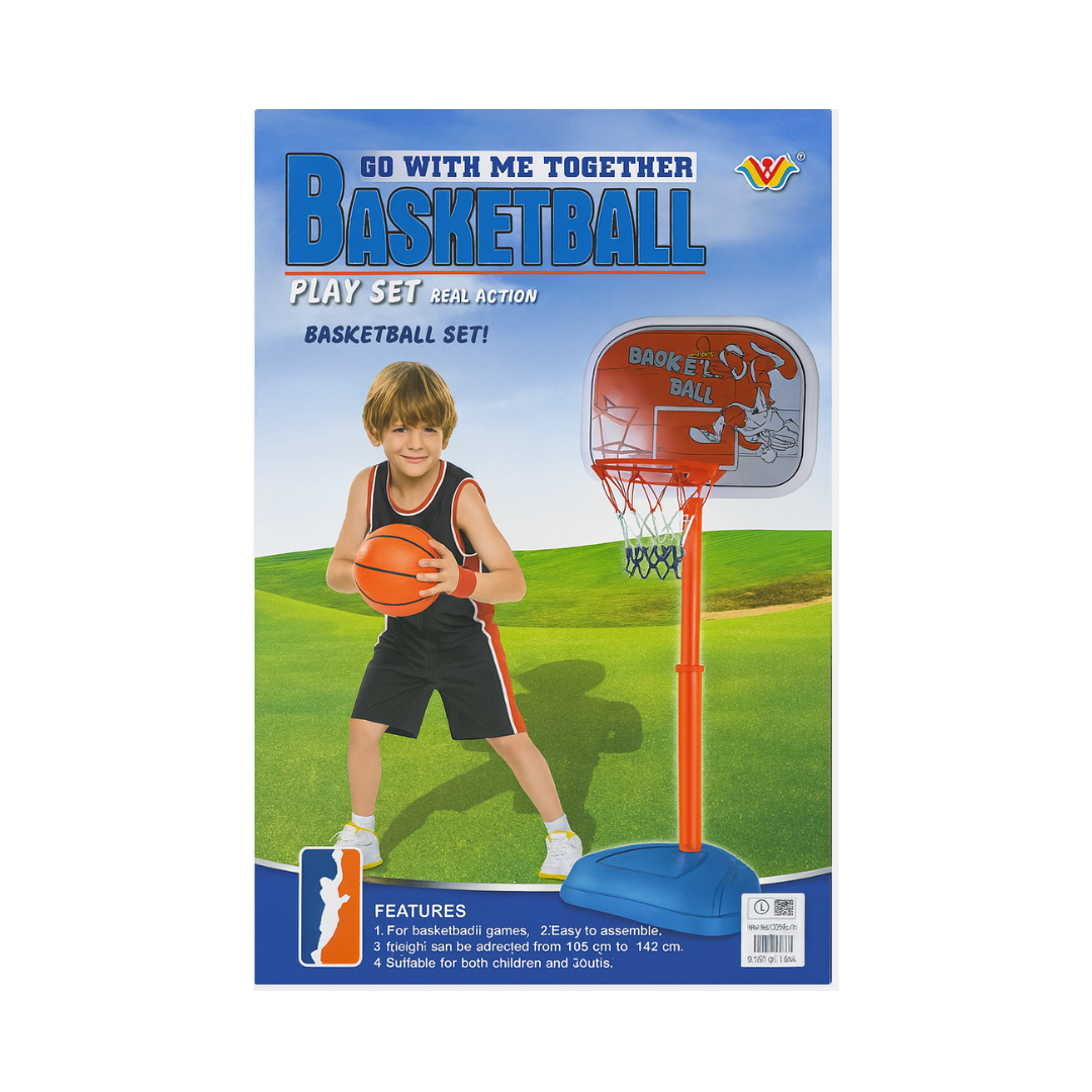 Kids’ basketball play set with adjustable hoop up to 170cm, sturdy base, 34cm backboard, and 21cm rim. Includes basketball (15cm), pump, and accessories.