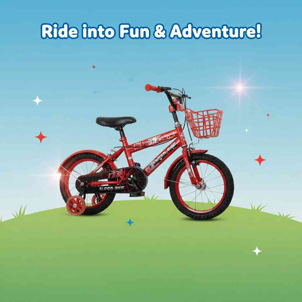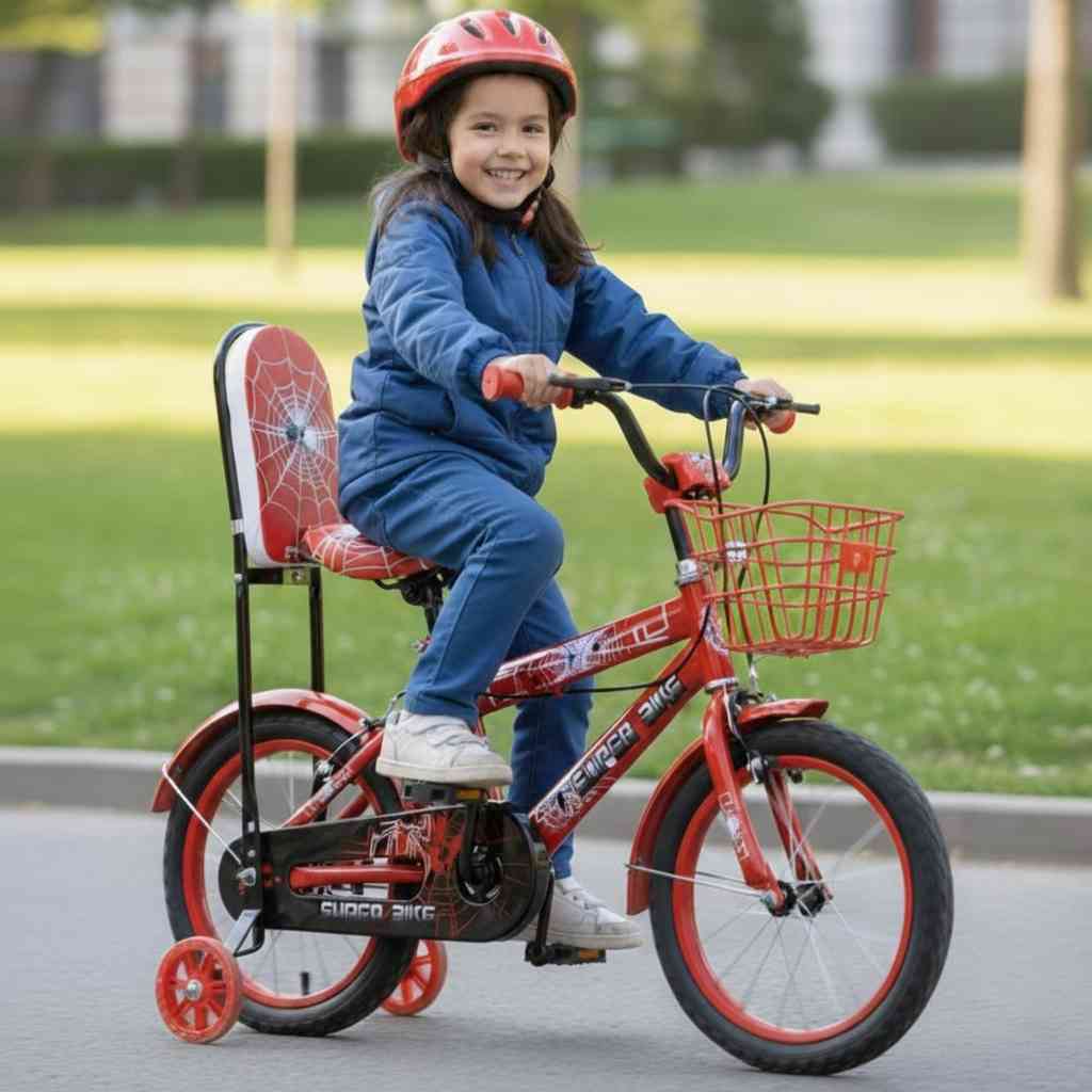 Inspired by superhero style, this red kids’ bike features a sporty design with eye-catching spider-web graphics. It comes equipped with a backrest seat for extra comfort and safety, as well as training wheels to help beginners ride with confidence.