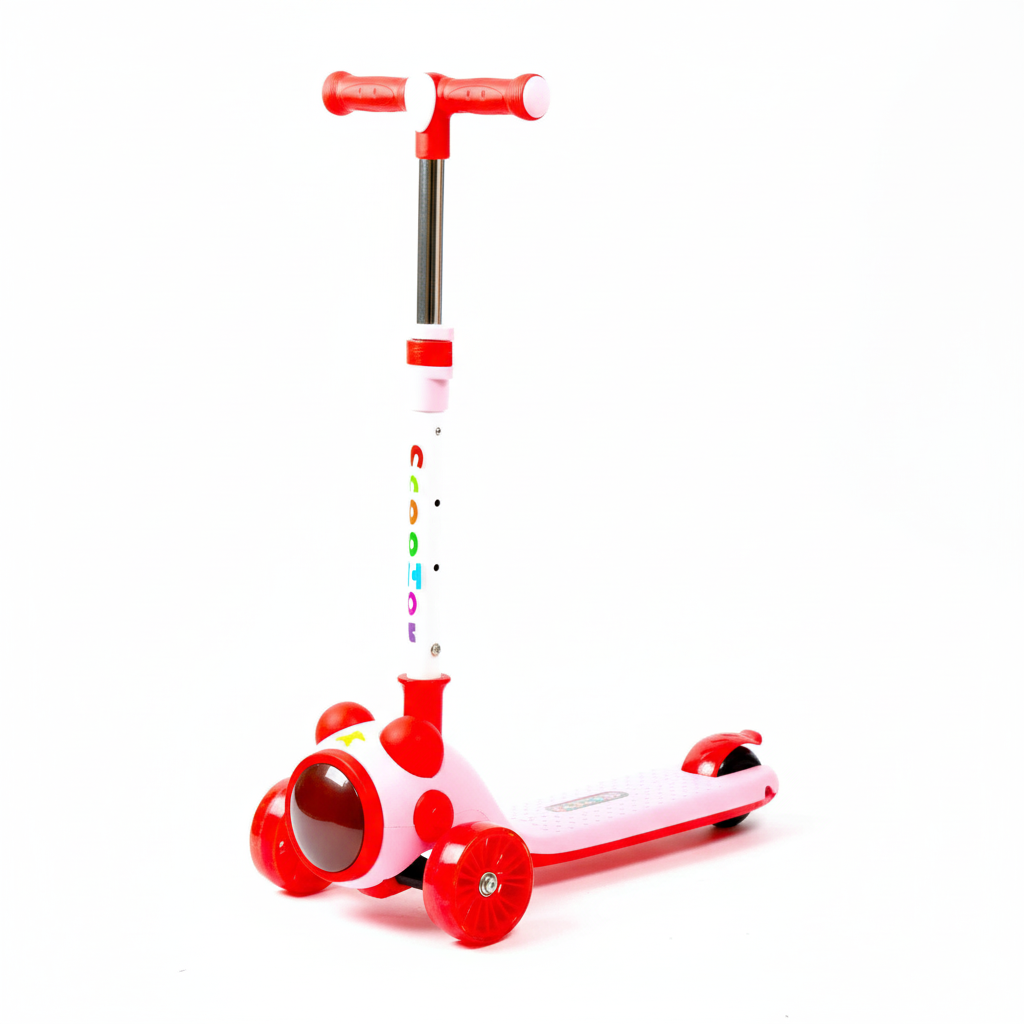 Kids' scooter with lights and music, featuring a fun pink and red design. Equipped with bright lights and sturdy wheels for stability and safety, providing children with an exciting and enjoyable riding experience.