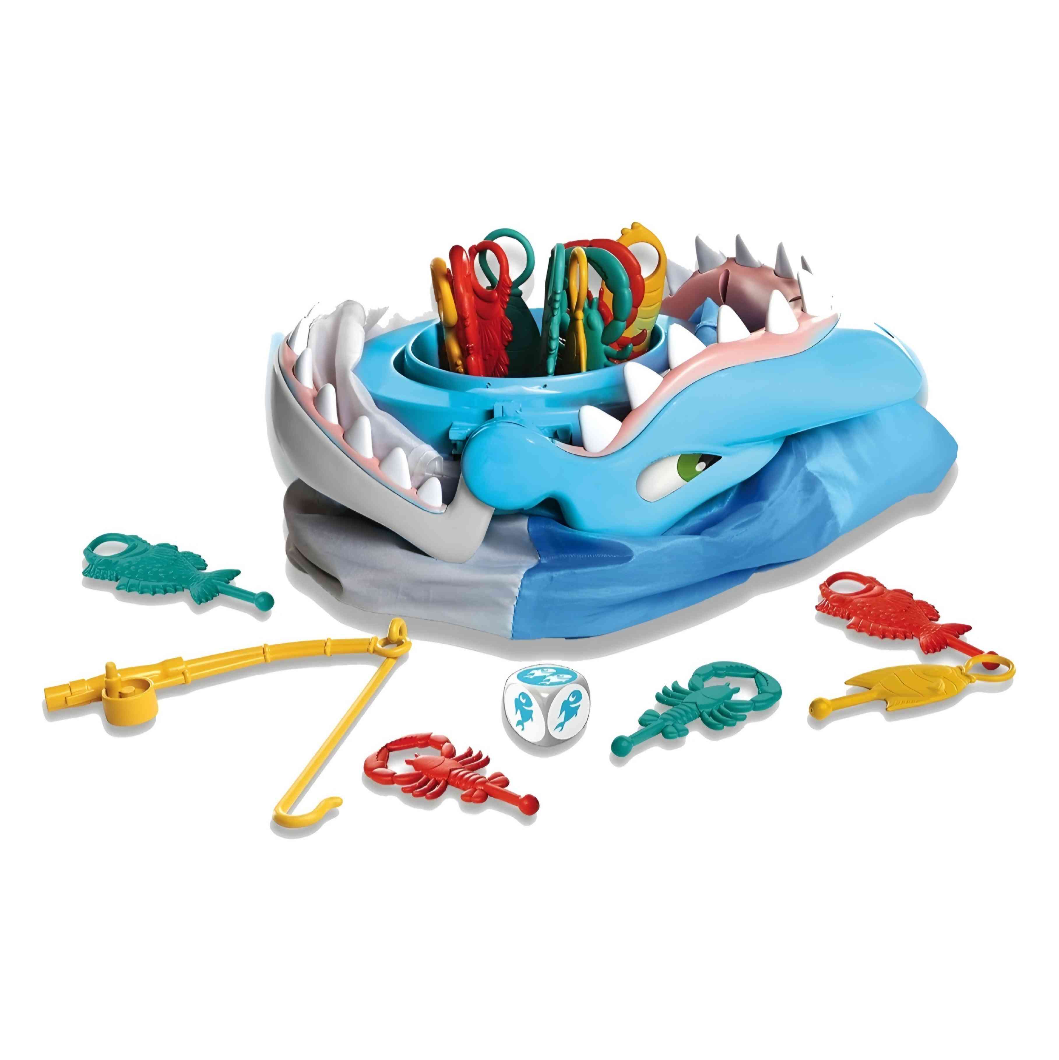 The game includes a large plastic shark figure that jumps up nearly 3 feet, 12 colorful sea creature figures, 2 fishing rods, a die, and instructions. 12 Players take turns rolling the die and using the fishing rods to try and snag the sea creatures before the shark jumps up and "bites" them. 35